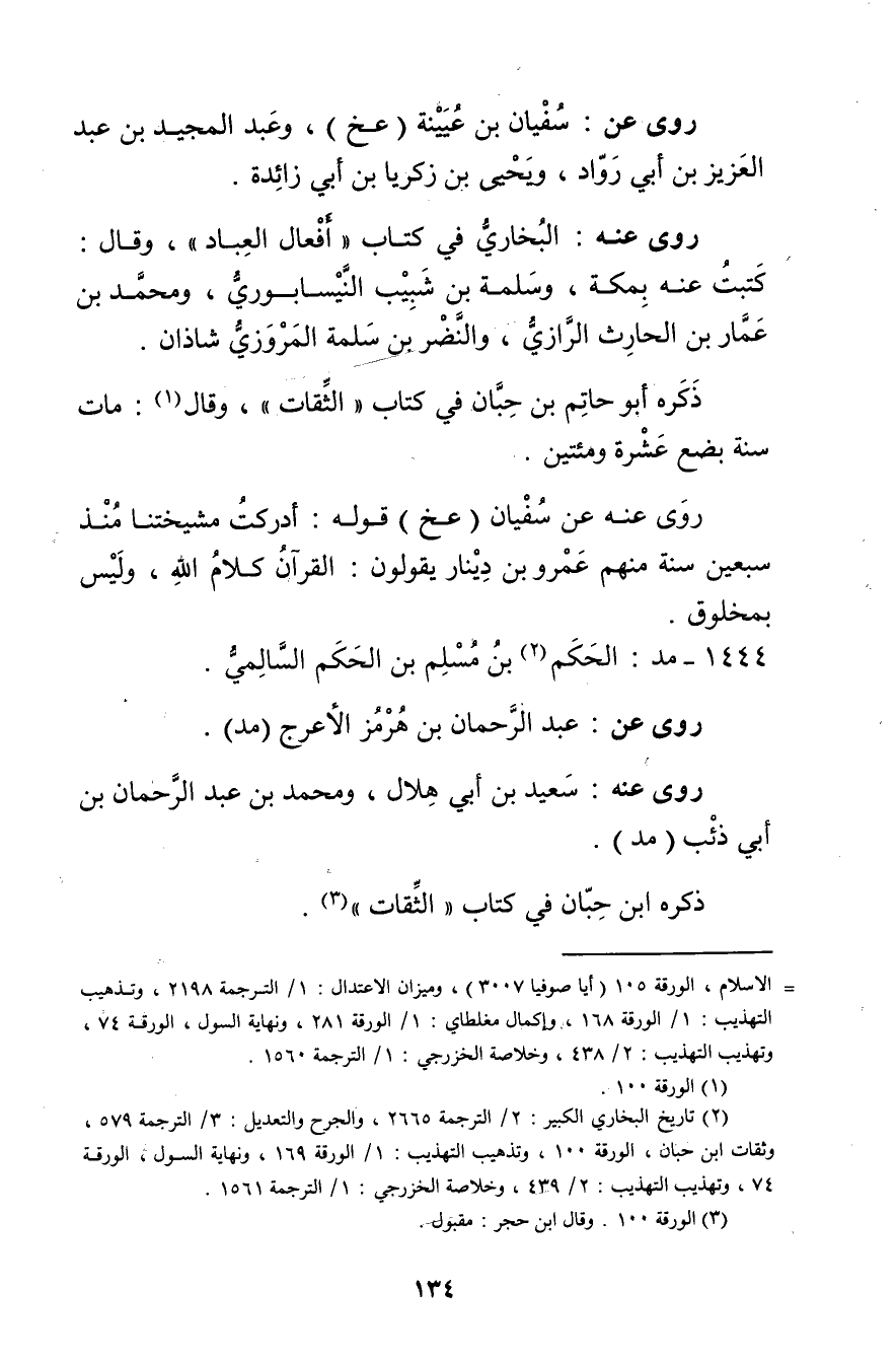 (2) ابن البخاري الكبير: 2 / الترجمة 2665، والجرح والتعديل: 3 / الترجمة 579، وثقات ابن حبان، الورقة 100، وتذهيب التهذيب: 1 / الورقة 169، ونهاية السول، الورقة 74، وتهذيب التهذيب: 2 / 439، وخلاصة الخزرجي: 1 / الترجمة 1561.