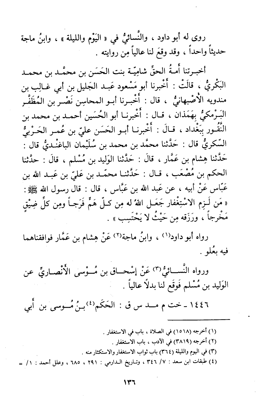 أَخْبَرَتْنَا أَمَةُ الْحَقِّ شَامِيَّةُ بِنْتُ الْحَسَنِ بْنِ مُحَمَّدِ بْنِ مُحَمَّدٍ الْبَكْرِيُّ، قَالَتْ: أَخْبَرَنَا أَبُو مَسْعُودٍ عَبْدُ الْجَلِيلِ بْنُ أَبي غَالِبِ بْنِ مَنْدَوَيْهِ الأَصْبَهَانِيُّ، قال: أخبرنا أَبُو الْمَحَاسِنِ نَصْرُ بْنُ الْمُظَفَّرِ الْبَرْمَكِيُّ بِهَمَذَانَ، قال: أَخْبَرَنَا أَبُو الْحُسَيْنِ أَحْمَدُ بْنُ مُحَمَّدِ بْنِ النَّقُّورِ بِبَغْدَادَ، قال: أَخْبَرَنَا أَبُو الْحَسَنِ عَلِيُّ بْنُ عُمَر الْحَرْبِيُّ السُّكَّرِيُّ قال: حَدَّثَنَا مُحَمَّد بْن مُحَمَّد بْن سُلَيْمان الْبَاغِنْدِيُّ قال: حَدَّثَنَا هِشَامُ بْنُ عَمَّارٍ، قال: حَدَّثَنَا الْوَلِيدُ بْنُ مُسْلِمٍ، قال: حَدَّثَنَا الْحَكَمُ بْنُ مُصْعَبٍ، قال: حَدَّثَنَا مُحَمَّدُ بْنُ علي بْن عَبد اللَّهِ بْن عَبَّاسٍ عَن أَبِيهِ، عَنْ عَبد اللَّهِ بْنِ عَبَّاسٍ، قال: قال رَسُول اللَّهِ صلى الله عليه وسَلَّمَ: مَنْ لَزِمَ الاسْتِغْفَارَ جَعَلَ اللهه لَهُ مِنْ كُلِّ هَمٍّ فَرَجًا ومِنْ كُلِّ ضِيقٍ مَخْرَجًا، ورَزَقَهُ مِنْ حَيْثُ لا يَحْتَسِبُ.