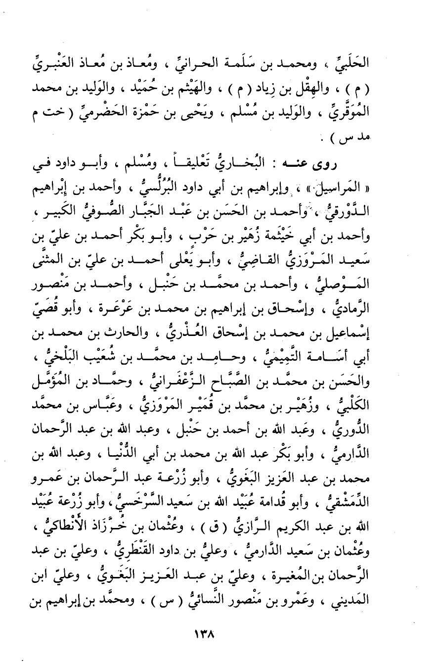 رَوَى عَنه: الْبُخَارِيّ تعليقا، ومسلم، وأَبُو داود في "المراسيل"، وإبراهيم بن أَبي داود البرلسي، وأَحْمَد بن إبراهيم الدورقي، وأَحْمَد بْن الْحَسَن بْن عَبْد الْجَبَّارِ الصوفي الكبير، وأَحْمَد بْن أَبي خيثمة زهير بْن حرب، وأَبُو بَكْر أَحْمَد بْن علي بْن سَعِيد المروزي القاضي، وأَبُو يَعْلَى أَحْمَد بْن علي بْن المثنى الموصلي، وأَحْمَد بْن مُحَمَّد بْن حنبل، وأَحْمَد بْن مَنْصُور الرمادي، وإسحاق بن إبراهيم بن مُحَمَّد بن عرعرة، وأَبُو قصي إسماعييل بن مُحَمَّد بن إسحاق العذري، والحارث بْن مُحَمَّد بْن أَبي أسامة التميمي، وحامد بن مُحَمَّد بْن شعيب البلخي، والحسن بْن مُحَمَّد بن الصباح الزعفراني، وحماد بن المؤمل الكلبي، وزهير بن مُحَمَّد بْن قمير المروزي، وعباس بْن مُحَمَّد الدوري، وعبد الله بْن أَحْمَد بْن حنبل، وعبد الله بْن عَبْد الرَّحْمَنِ الدارمي، وأَبُو بَكْر عَبد اللَّهِ بْن مُحَمَّد بْن أَبي الدنيا، وعبد اللَّهِ بْن مُحَمَّد بْن عَبْد العزيز البغوي، وأَبُو زُرْعَة عبد الرَّحْمَنِ بْن عَمْرو الدمشقي، وأَبُو قدامة عُبَيد اللَّهِ بْن سَعِيد السرخسي، وأَبُو زُرْعَة عُبَيد الله بن عبد الكريم الرازي (ق) ، وعثمان بن خرزاد الأنطاكي، وعثمان بن سَعِيد الدارمي، وعلي بن داود القنطري، وعلي بْن عَبْد الرَّحْمَنِ بْن المغيرة، وعلي بْن عَبْد الْعَزِيزِ البغوي، وعلي ابن المديني، وعَمْرو بن منصور النَّسَائي (س) ، ومحمد بْن إِبْرَاهِيم بْن