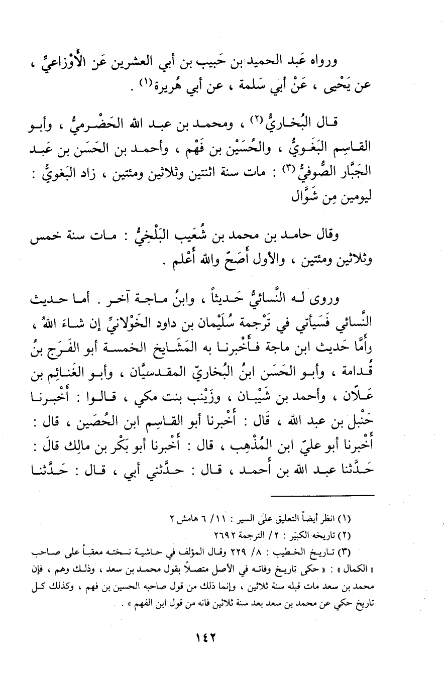 (3) تاريخ الخطيب: 8 / 229 وَقَال المؤلف في حاشية نسخته معقبا على صاحب "الكمال": حكى تاريخ وفاته في الاصل متصلا بقول محمد بن سعد، وذلك وهم، فإن محمد بن سعد مات قبله سنة ثلاثين، وإنما ذلك من قول صاحبه السحين بن فهم، وكذلك كل تاريخ حكي عن محمد بن سعد بعد سنة ثلاثين فانه من قول ابن الفهم".