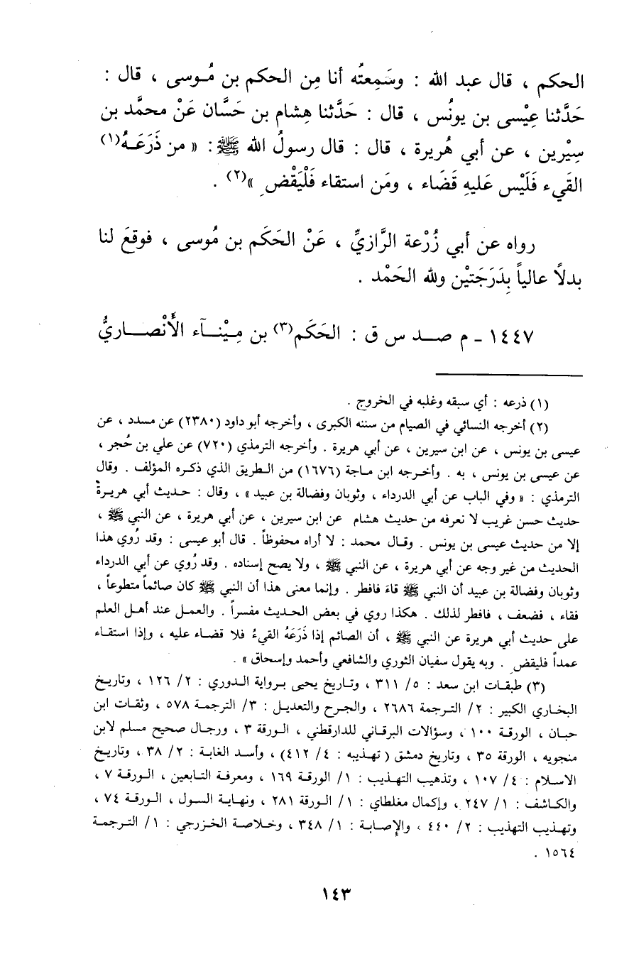 الْحَكَمُ، قال عَبد اللَّهِ، وسَمِعْتُهُ أَنَا مِنَ الْحَكَمِ بْنِ مُوسَى، قال: حَدَّثَنَا عِيسَى بْنُ يُونُسَ، قال: حَدَّثَنَا هِشَامُ بْنُ حَسَّانٍ عَنْ مُحَمَّدِ بْنِ سِيرِينَ، عَن أَبِي هُرَيْرة، قال: قال رَسُولُ اللَّهِ صلى الله عليه وسلم: من ذرعه (1) القئ فَلَيْسَ عَلَيْهِ قَضَاءٌ، ومَنِ اسْتَقَاءَ فَلْيَقْضِ" (2) .