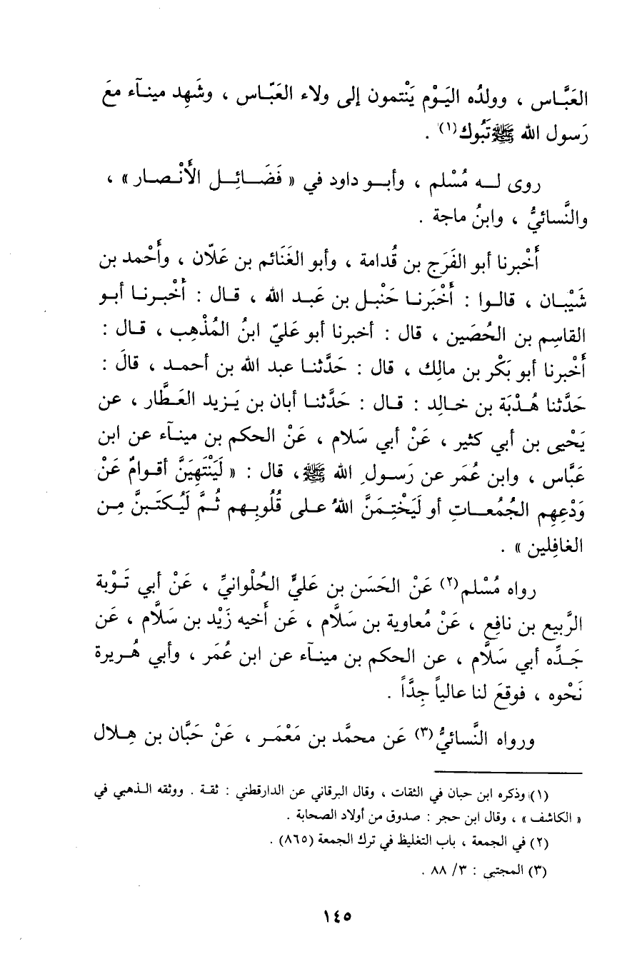 أخبرنا أَبُو الْفَرَجِ بْنُ قُدَامَةَ، وأبو الغنائم بْن علان، وأحمد بْنُ شَيْبَانَ، قَالُوا: أَخْبَرَنَا حَنْبَلُ بْن عَبد الله، قال أَخْبَرَنَا أبو القاسم بْن الحصين، قال: أَخْبَرَنَا أَبُو عَلِيِّ ابْنُ الْمُذْهِب، قال: أَخْبَرَنَا أبو بكر بْن مالك، قال: حَدَّثَنَا عَبد الله بْنُ أَحْمَدَ، قال: حَدَّثَنَا هُدْبَةُ بْنُ خَالِدٍ: قال: حَدَّثَنَا أَبَانُ بْنُ يَزِيدَ الْعَطَّارُ، عَنْ يَحْيَى بْن أَبي كثير، عَن أبي سَلامٍ، عَنِ الْحَكَمِ بْنِ مِينَاءَ عَنِ ابْنِ عَبَّاسٍ، وابْنِ عُمَر عن رَسُولِ اللَّهِ صَلَّى اللَّهُ عليه وسلم، قال: (لينتهن أَقْوَامٌ عَنْ ودْعِهِمُ الْجُمُعَاتِ أَوْ لَيَخْتِمَنَّ اللَّهُ عَلَى قُلُوبِهِمْ ثُمَّ لَيُكْتَبُنَّ مِنَ الْغَافِلِينَ) .
