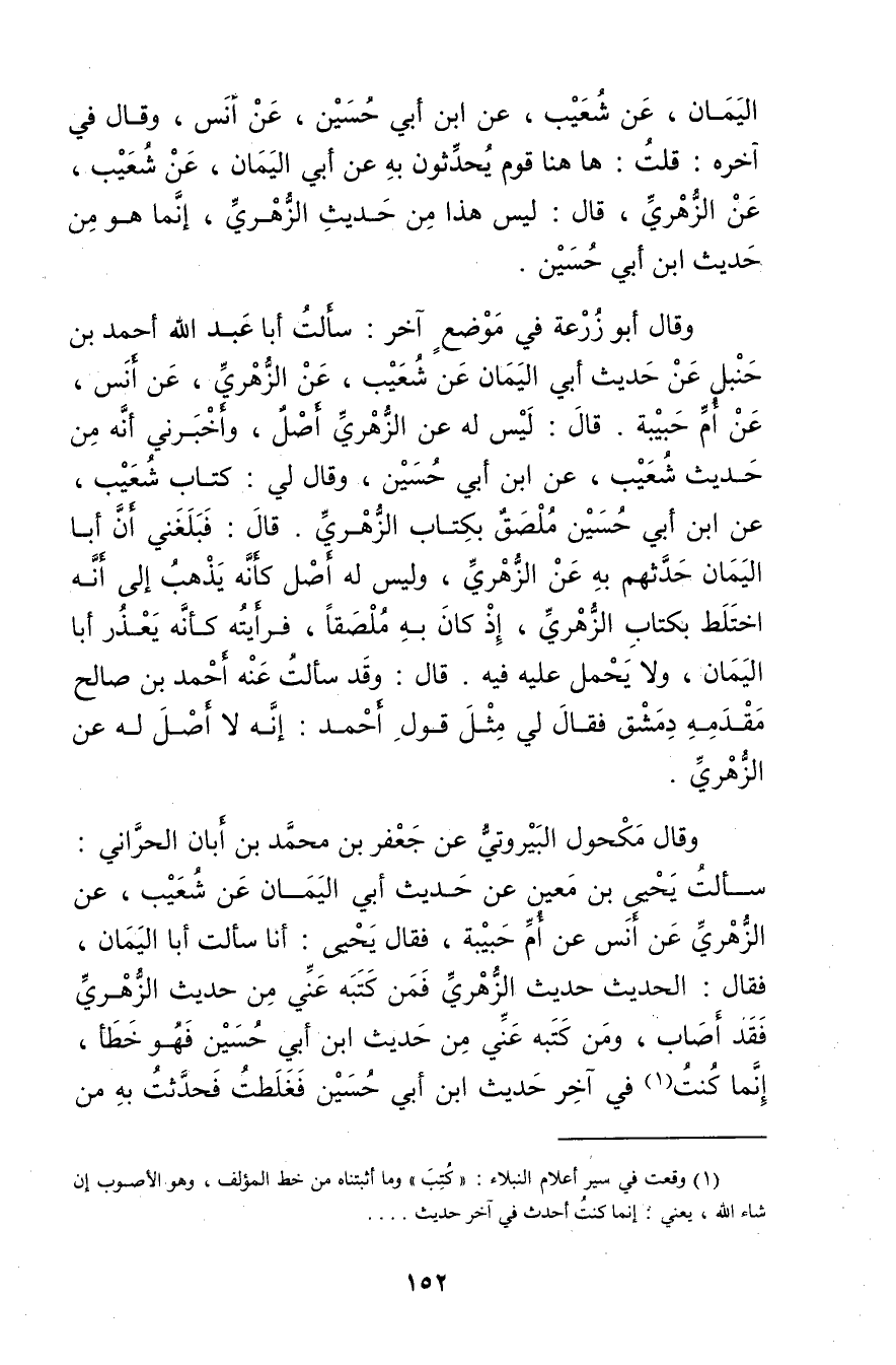 قال: لَيْسَ لَهُ عَنِ الزُّهْرِيّ أَصْلٌ، وأَخْبَرَنِي أَنَّهُ مِنْ حَدِيثِ شُعَيْبٍ، عَنِ ابْنِ أَبي حُسَيْنٍ، وَقَال لِي: كِتَابُ شُعَيْبٍ، عَنِ ابْنِ أَبي حُسَيْنٍ مُلْصَقٌ بِكِتَابِ الزُّهْرِيّ. قال: فَبَلَغَنِي أَنَّ أَبَا الْيَمَانِ حَدَّثَهُمْ بِهِ عَنِ الزُّهْرِيّ، ولَيْسَ له أصلا كَأَنَّهُ يَذْهَبُ إِلَى أَنَّهُ اخْتَلَطَ بِكِتَابِ الزُّهْرِيّ، إِذْ كَانَ بِهِ مُلْصَقًا، فَرَأَيْتُهُ كَأَنَّهُ يَعْذُرُ أَبَا الْيَمَانِ، ولا يَحْمِلُ عَلَيْهِ فِيهِ. قال: وقَدْ سَأَلْتُ عَنْهُ أَحْمَدَ بْنَ صَالِحٍ مَقْدَمَهُ دِمِشْقَ فَقَالَ لِي مِثْلَ قَوْلِ أَحْمَدَ: إِنَّهُ لا أَصْلَ لَهُ عَنِ الزُّهْرِيّ.