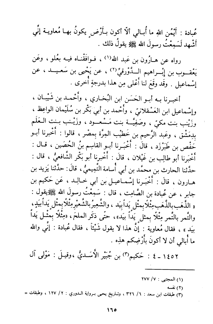 أخبرنا بِهِ أَبُو الْحَسَنِ بْنُ الْبُخَارِيِّ، وأَحْمَدُ بْنُ شَيْبَانَ، وإِسْمَاعِيلُ ابن الْعَسْقَلانِيِّ، وأَحْمَدُ بْنُ أَبي بَكْرِ بْنِ سُلَيْمان الْوَاعِظُ، وزَيْنَبُ بِنْتُ مَكِّيٍّ، وصَفِيَّةُ بِنْتُ مَسْعُودٍ، وزَيْنَبُ بِنْتُ الْعَلَمِ بِدِمَشْقَ، وعَبْدُ الرَّحِيمِ بْنُ خَطِيبِ الْمِرَّةَ بِمِصْرَ، قَالُوا: أخبرنا أبو حفص بن طَبَرْزَذَ، قال: أَخْبَرَنَا أبو القاسم بْن الحصين، قال: أخبرنا أَبُو طالب بْنُ غَيْلانَ، قال: أَخْبَرَنَا أَبُو بَكْرٍ الشَّافِعِيُّ، قال: حَدَّثَنَا الْحَارِثُ بْن مُحَمَّد بْن أَبي أسامة التَّمِيمِيُّ، قال: حَدَّثَنَا يَزِيدُ بْنُ هَارُونَ، قال: أَخْبَرَنَا إِسْمَاعِيلُ بْنُ أَبي خَالِدٍ، عن حَكِيمِ بْنِ جَابِرٍ، عَنْ عُبَادَةَ بْنِ الصَّامِتِ، قال: سَمِعْتُ رَسُولَ اللَّهِ صَلَّى اللَّهُ عَلَيْهِ وسَلَّمَ يَقُولُ: الذَّهَبُ بِالذَّهَبِ مِثْلا بِمِثْلٍ يَدًا بِيَدٍ، والشَّعِيرُ بِالشَّعِيرِ مِثْلا بِمِثْلٍ يَدًا بِيَدٍ، والتَّمْرُ بِالتَّمْرِ مِثْلا بِمِثْلٍ يَدًا بِيَدٍ"، حَتَّى ذَكَرَ الْمِلْحَ،"مِثْلا بِمِثْلٍ يَدًا بِيَدٍ"، فَقَالَ مُعَاوِيَةُ: إِنَّ هَذَا لا يَقُولُ شَيْئًا، فَقَالَ عُبَادَةُ: إِنِّي واللَّهِ مَا أُبَالِي أَنْ لا أَكُونَ بِأَرْضِكُمْ هَذِهِ.