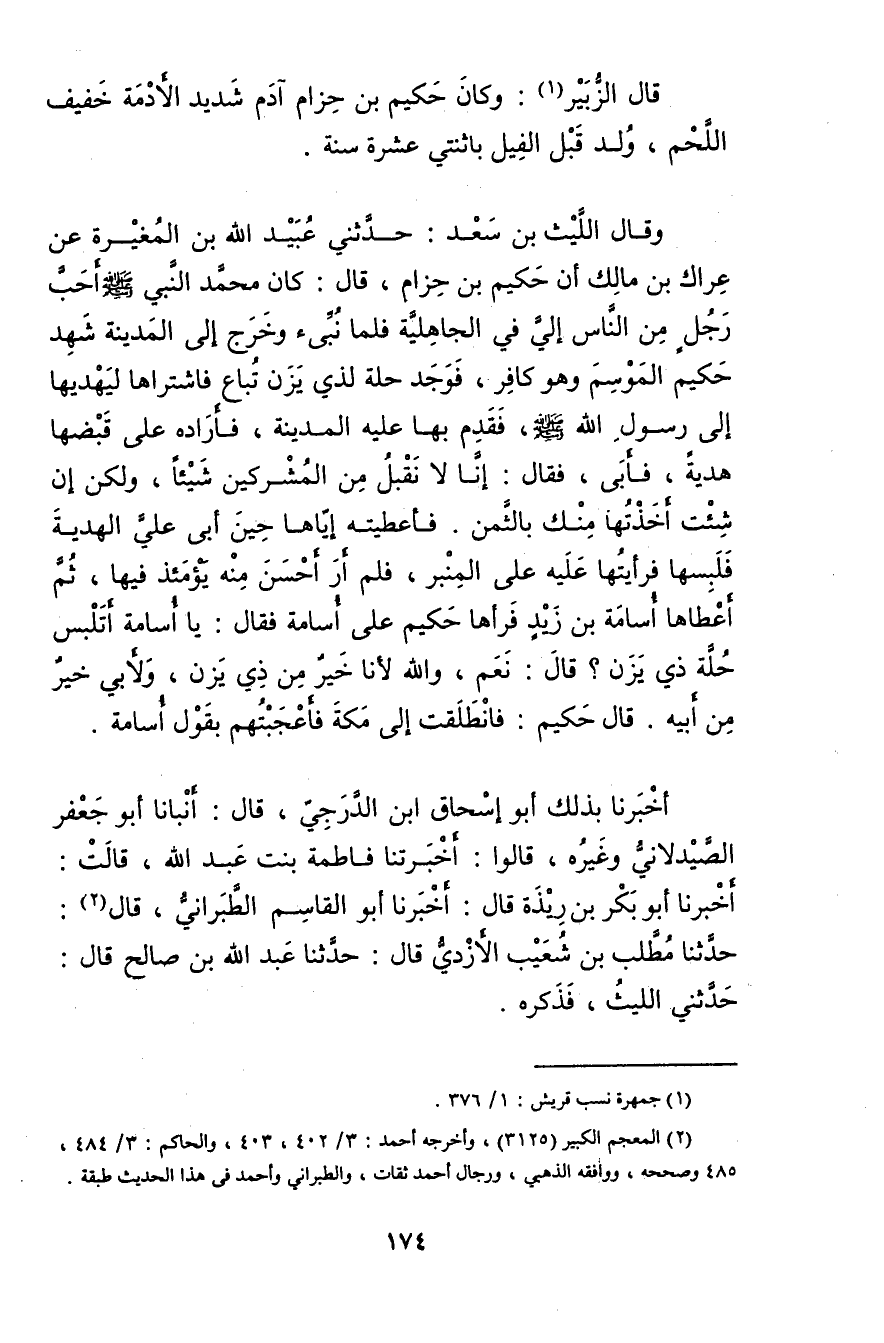 رَجُلٍ مِنَ النَّاسِ إِلَيَّ فِي الْجَاهِلِيَّةِ فَلَمَّا نُبِّئَ وخَرَجَ إِلَى الْمَدِينَةِ شَهِدَ حَكِيمٌ الْمَوْسِمَ وهُوَ كَافِرٌ، فَوَجَدَ حُلَّةً لِذِي يَزَنَ تُبَاعُ فَاشْتَرَاهَا لِيُهْدِيَهَا إِلَى رَسُولِ اللَّهِ صَلَّى اللَّهُ عَلَيْهِ وسَلَّمَ، فَقَدِمَ بِهَا عَلَيْهِ الْمَدِينَةَ، فَأَرَادَهُ عَلَى قَبْضِهَا هَدِيَّةً، فَأَبَى، فَقَالَ: إِنَّا لا نَقْبَلُ مِنَ الْمُشْرِكِينَ شَيْئًا، ولَكِنْ إِنْ شِئْتَ أَخَذْتُهَا مِنْكَ بِالثَّمَنِ. فَأَعْطَيْتُهُ إِيَّاهَا حِينَ أَبَى عَلَيَّ الْهَدِيَّةَ فَلَبِسَهَا فَرَأَيْتُهَا عَلَيْهِ عَلَى الْمِنْبَرِ، فَلَمْ أَرَ أَحْسَنَ مِنْهُ يؤمئذ فِيهَا، ثُمَّ أَعْطَاهَا أُسَامَةَ بْنَ زَيْدٍ فَرَآهَا حَكِيمٌ عَلَى أُسَامَةَ فَقَالَ: يَا أُسَامَةُ أَتَلْبَسُ حُلَّةَ ذِي يَزَنَ؟ قال: نَعَمْ، واللَّهِ لأَنَا خَيْرٌ مِنْ ذِي يَزَنَ، ولأَبِي خَيْرٌ مِنْ أَبِيهِ. قال حَكِيمٌ: فَانْطَلَقْتُ إِلَى مَكَّةَ فَأَعْجَبْتُهُمْ بِقَوْلِ أُسَامَةَ.