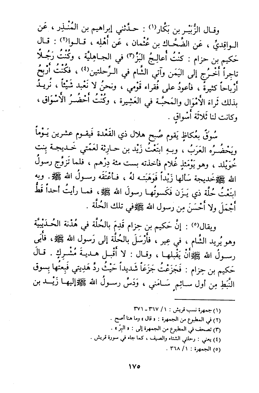 وَقَال الزبير بْن بكار (1) : حَدَّثَنِي إِبْرَاهِيمُ بْنُ الْمُنْذِرِ، عَنِ الْوَاقِدِيِّ، عَنِ الضَّحَّاكِ بْنِ عُثْمَانَ، عَنْ أَهْلِهِ، قَالُوا (2) : قال حَكِيمُ بْنُ حِزَامٍ: كُنْتُ أُعَالِجُ الْبَزَّ (3) فِي الْجَاهِلِيَّةِ، وكُنْتُ رَجُلا تَاجِرًا أَخْرُجُ إِلَى الْيَمَنِ وآتِي الشَّامَ فِي الرِّحْلَتَيْنِ (4) ، فَكُنْتُ أَرْبَحُ أَرْبَاحًا كَثِيرَةً، فَأَعُودُ عَلَى فُقَرَاءِ قَوْمِي، ونَحْنُ لا نَعْبُدُ شَيْئًا، نُرِيدُ بِذَلِكَ ثَرَاءَ الأَمْوَالِ والْمَحَبَّةَ فِي الْعَشِيرَةِ، وكُنْتُ أَحْضُرُ الأَسْوَاقَ، وكَانَتْ لَنَا ثَلاثَةُ أَسْوَاقٍ.