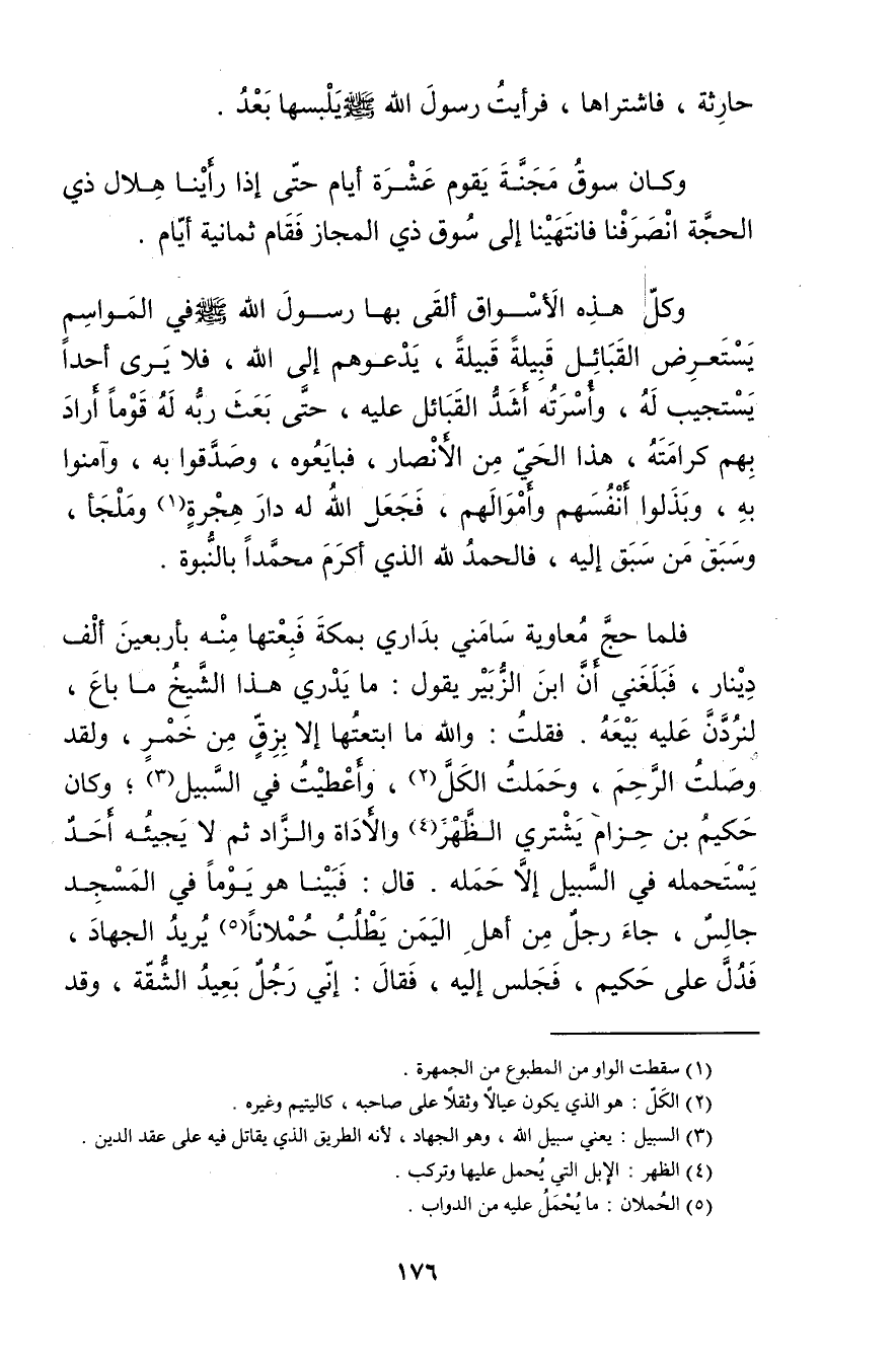 وكُلُّ هَذِهِ الأَسْوَاقُ أَلْقَى بِهَا رَسُولَ اللَّهِ صَلَّى اللَّهُ عَلَيْهِ وسَلَّمَ فِي الْمَوَاسِمِ يَسْتَعْرِضُ الْقَبَائِلَ قَبِيلَةً قَبِيلَةً، يَدْعُوهُمْ إِلَى اللَّهِ، فَلا يَرَى أَحَدًا يَسْتَجِيبُ لَهُ، وأُسْرَتُهُ أَشَدُّ الْقَبَائِلِ عَلَيْهِ، حَتَّى بَعَثَ رَبُّهُ لَهُ قَوْمًا أَرَادَ بِهِمْ كَرَامَتَهُ، هَذَا الْحَيُّ مِنَ الأَنْصَارِ، فَبَايَعُوهُ، وصَدَّقُوا بِهِ، وآمَنُوا بِهِ، وبَذَلُوا أَنْفُسَهُمْ وأَمْوَالَهُمْ، فَجَعَلَ اللَّهُ لَهُ دَارَ هِجْرَةٍ (1) ، ومَلْجَأً، وسَبَقَ مَنْ سَبَقَ إِلَيْهِ، فَالْحَمْدُ لِلَّهِ الَّذِي أَكْرَمَ مُحَمَّدًا بِالنُّبُوَّةِ.