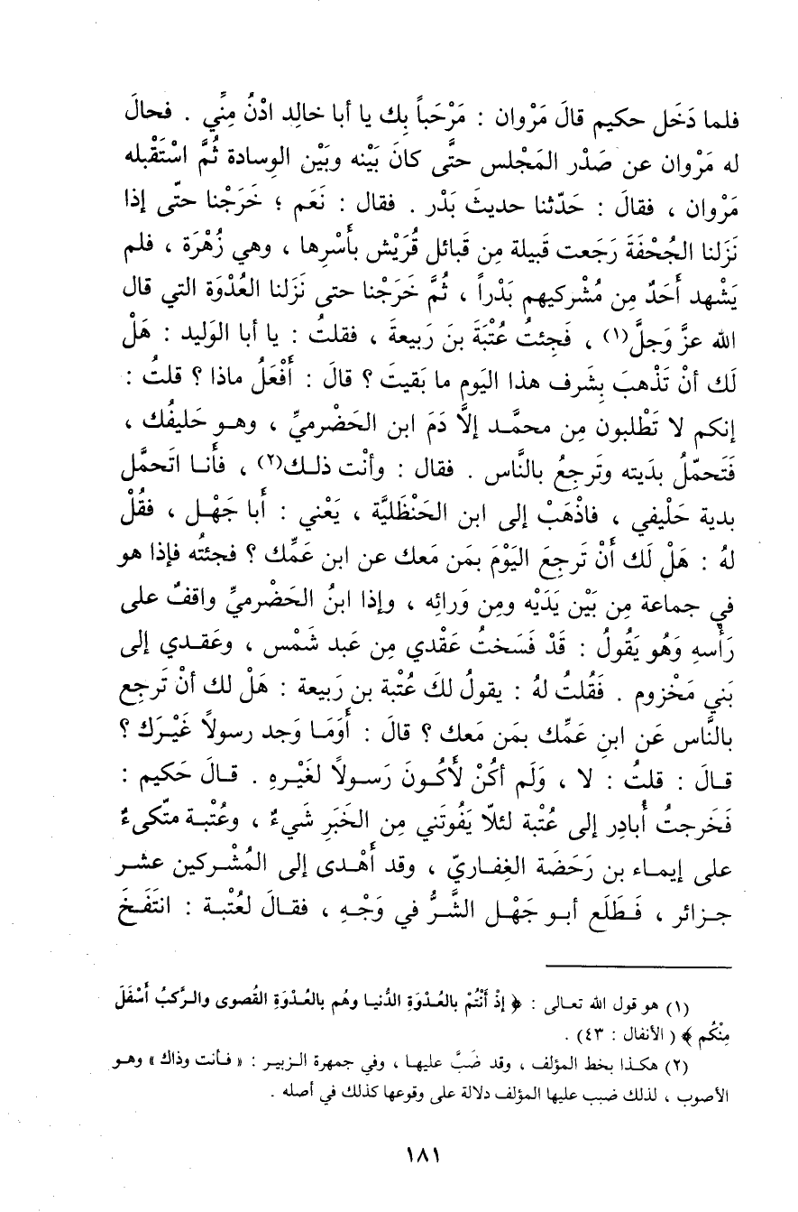فلما دخل حكيم قال مروان: مرجبا بك يا أبا خالد ادن مني. فحال له مروان عن صدر المجلس حتى كان بينه وبين الوسادة ثم استقبله مروان، فَقَالَ: حَدَّثَنَا حديث بدر. فَقَالَ: نعم، خرجنا حتى إذا نزلنا الجحفة رجعت قبيلة من قبائل قريش بأسرها، وهي زهرة، فلم يشهد أحد من مشركيهم بدرا، ثم خرجنا حتى نزلنا العدوة التي قال الله عزوجل (1) ، فجئت عتبة بن ربيعة، فقلت: يا أبا الوليد: هل لك أن تذهب بشرف هذا اليوم ما بقيت؟ قال: أفعل ماذا؟ قلت: إنكم لا تطلبون من مُحَمَّد إلا دم ابن الحضرمي، وهو حليفك، فتحمل بديته وترجع بالناس.
