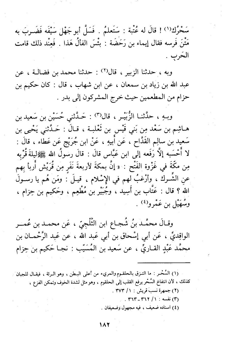 وبه، حَدَّثَنَا الزُّبَيْرُ، قال (3) : حَدَّثَنِي حُسَيْنُ بْنُ سَعِيد بْنِ هَاشِمِ بْنِ سَعْدٍ مِنْ بَنِي قَيْسِ بْنِ ثَعْلَبَةَ، قال: حَدَّثَنِي يَحْيَى بْنُ سَعِيد بْنِ سَالِمٍ الْقَدَّاحُ، عَن أَبِيهِ، عَنِ ابْنِ جُرَيْج عَنْ عَطَاءٍ، قال: لا أَحْسَبُهُ إِلا رَفَعَهُ إِلَى ابْنِ عَبَّاسٍ قال: قال رَسُولُ اللَّهِ صلى الله عَلَيْهِ وسَلَّمَ لَيْلَةَ قُرْبِهِ مِنْ مَكَّةَ فِي غَزْوَةِ الْفَتْحِ: إِنَّ بِمَكَّةَ لأَرْبَعَةُ نَفَرٍ مِنْ قُرَيْشٍ أَرْبَأُ بِهِمْ عَنِ الشِّرْكِ، وأَرْغَبُ لَهُمْ فِي الإِسْلامِ، قِيلَ: ومَنْ هُمْ يَا رَسُولَ اللَّهِ؟ قال: عتاب ابن أَسِيدٍ، وجُبَيْرُ بْنُ مُطْعِمٍ، وحَكِيمُ بْنُ حِزَامٍ، وسُهَيْلُ بْنُ عَمْرو (4) .
