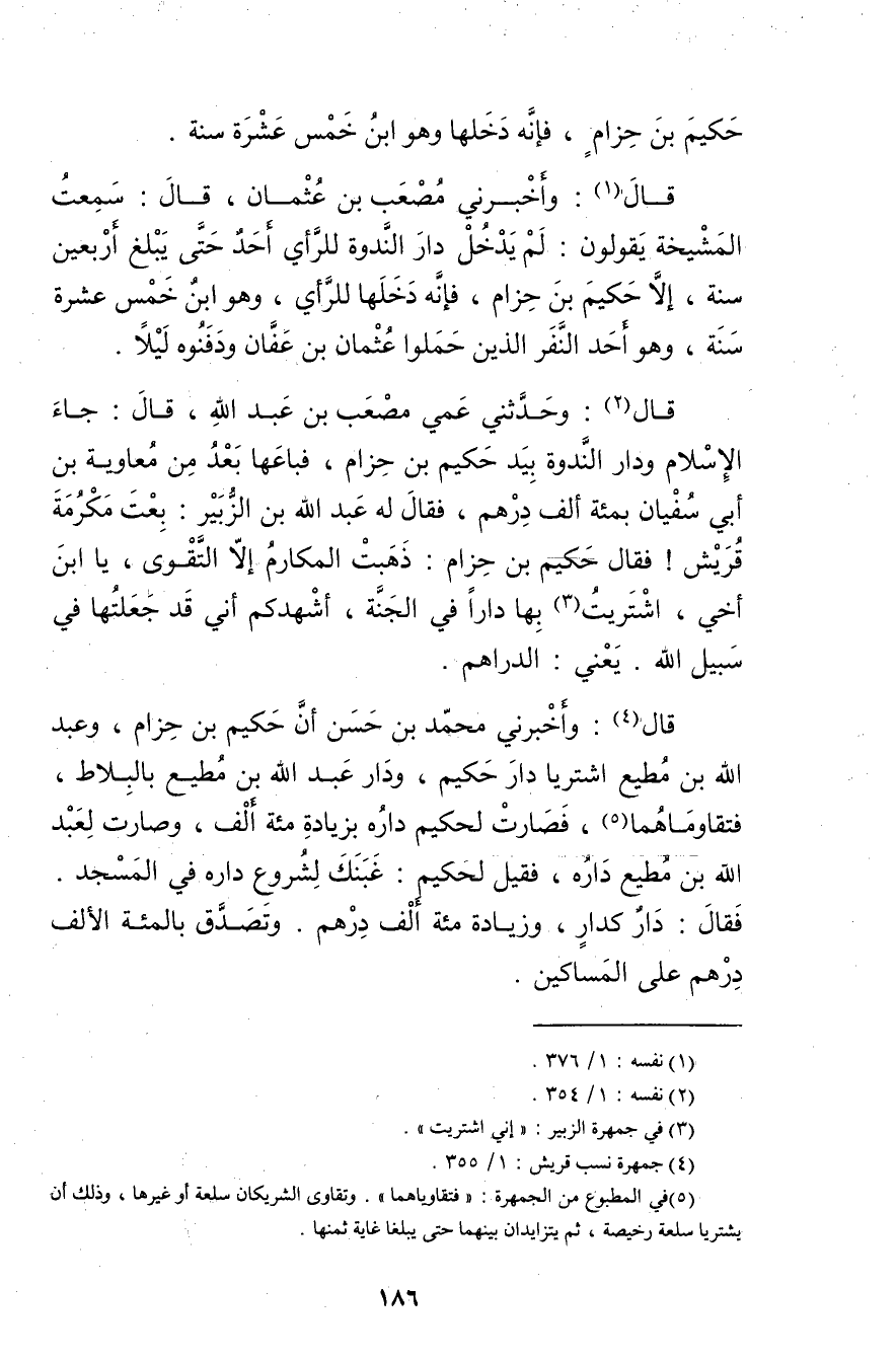 قال (2) : وحَدَّثَنِي عمي مصعب بن عَبد اللَّهِ، قال: جاء الإسلام ودار الندوة بيد حكيم بن حزام، فباعها بعد من معاوية بن أبي سفيان بمئة ألف درهم، فَقَالَ له عَبد اللَّهِ بن الزبير: بعت مكرمة قريش! فَقَالَ حكيم بن حزام: ذهبت المكارم التقوى، يا ابن أخي، اشتريت (3) بها دارا في الجنة، أشهدكم أني قد جعلتها في سبيل الله. يعني: الدراهم.