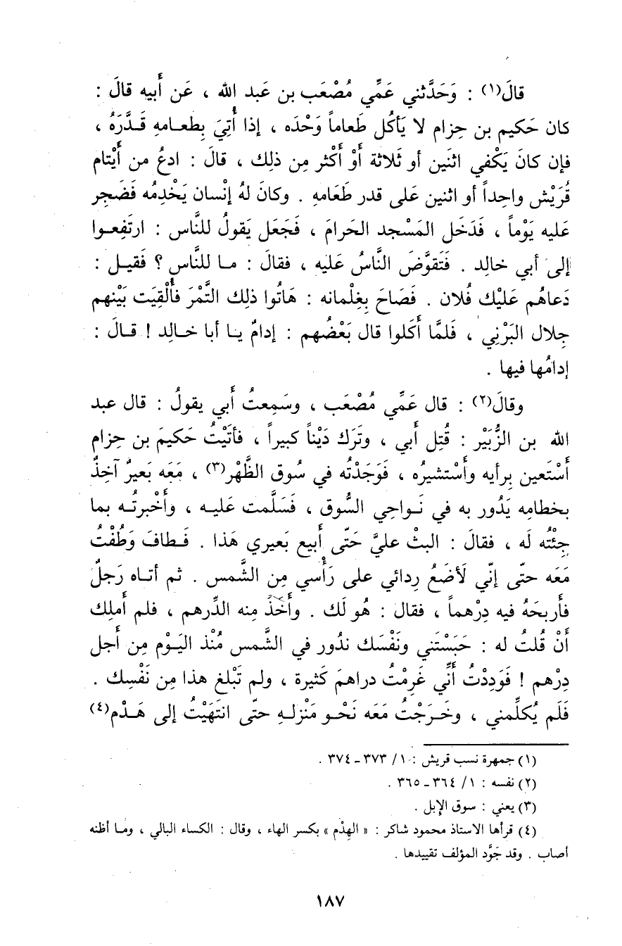 قال (1) : وحَدَّثَنِي عمي مصعب بن عَبد اللَّهِ، عَن أبيه قال: كان حكيم بن حزام لا يأكل طعاما وحده، إذا أتي بطعامه قدره، فإن كان يكفي اثنين أو ثلاثة أو أكثر من ذلك، قال: ادع من أيتام قريش واحدا أو اثنين على قدر طعامه. وكان له إنسان يخدمه فضجر عليه يوما، فدخل المسجد الحرام، فجعل يقول للناس: ارتفعوا إلى أبي خالد. فتقوض الناس عليه، فَقَالَ: ما للناس؟ فقيل: دعاهم عليك فلان. فصاح بغلمانه: هاتوا ذلك التمر فألقيت بينهم جلال البرني، فلما أكلوا قال بعضهم: إدام يا أبا خالد! قال: إدامها فيها.