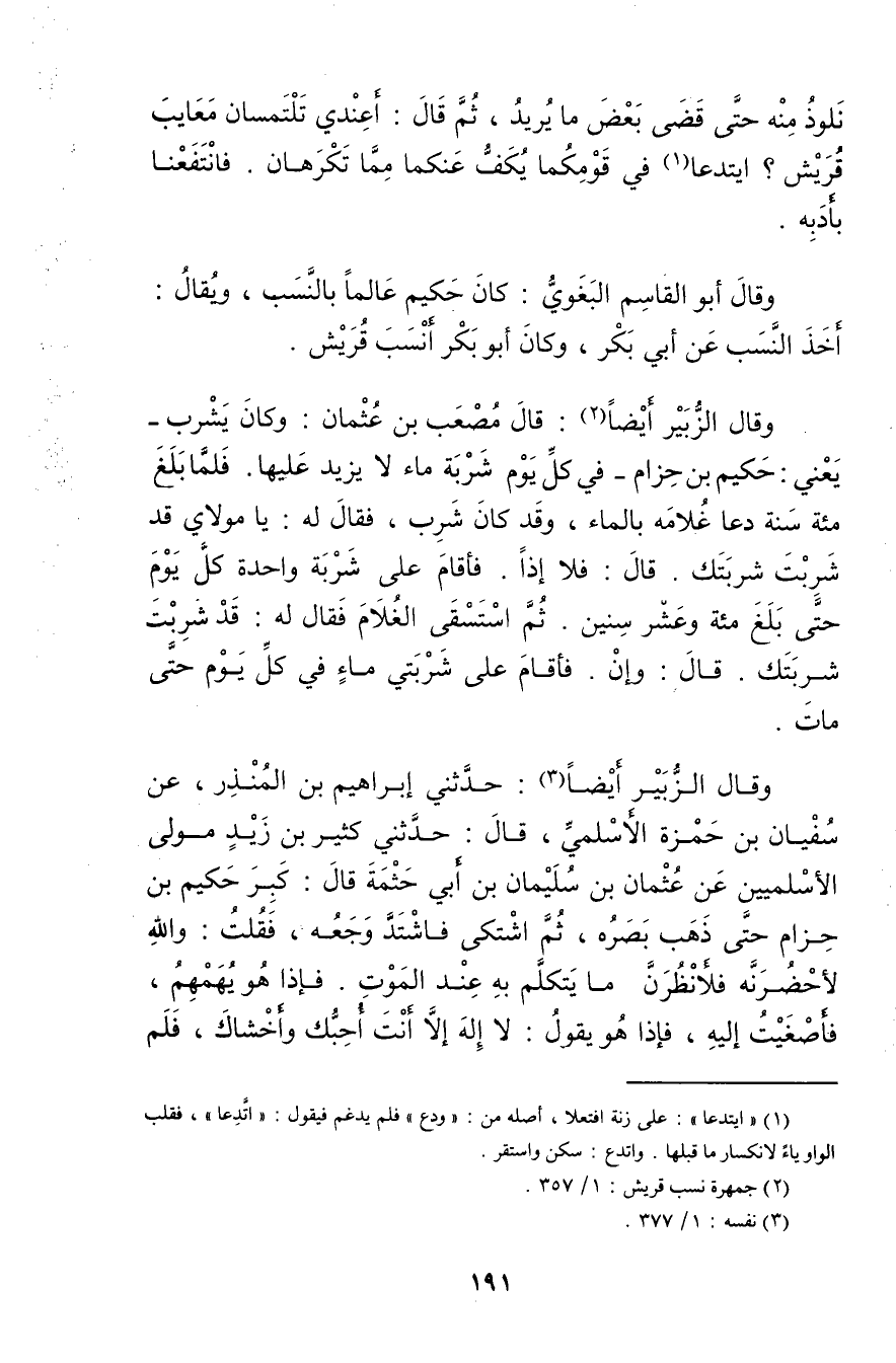 وَقَال الزبير أيضا (2) : قال مصعب بن عثمان: وكان يشرب، يعني: حكيم بن حزام - في كل يوم شربة ماء لا يزيد عليها. فلما بلغ مئة سنة دعا غلامه بالماء، وقد كان شرب، فَقَالَ له: يا مولاي قد شربت شربتك.