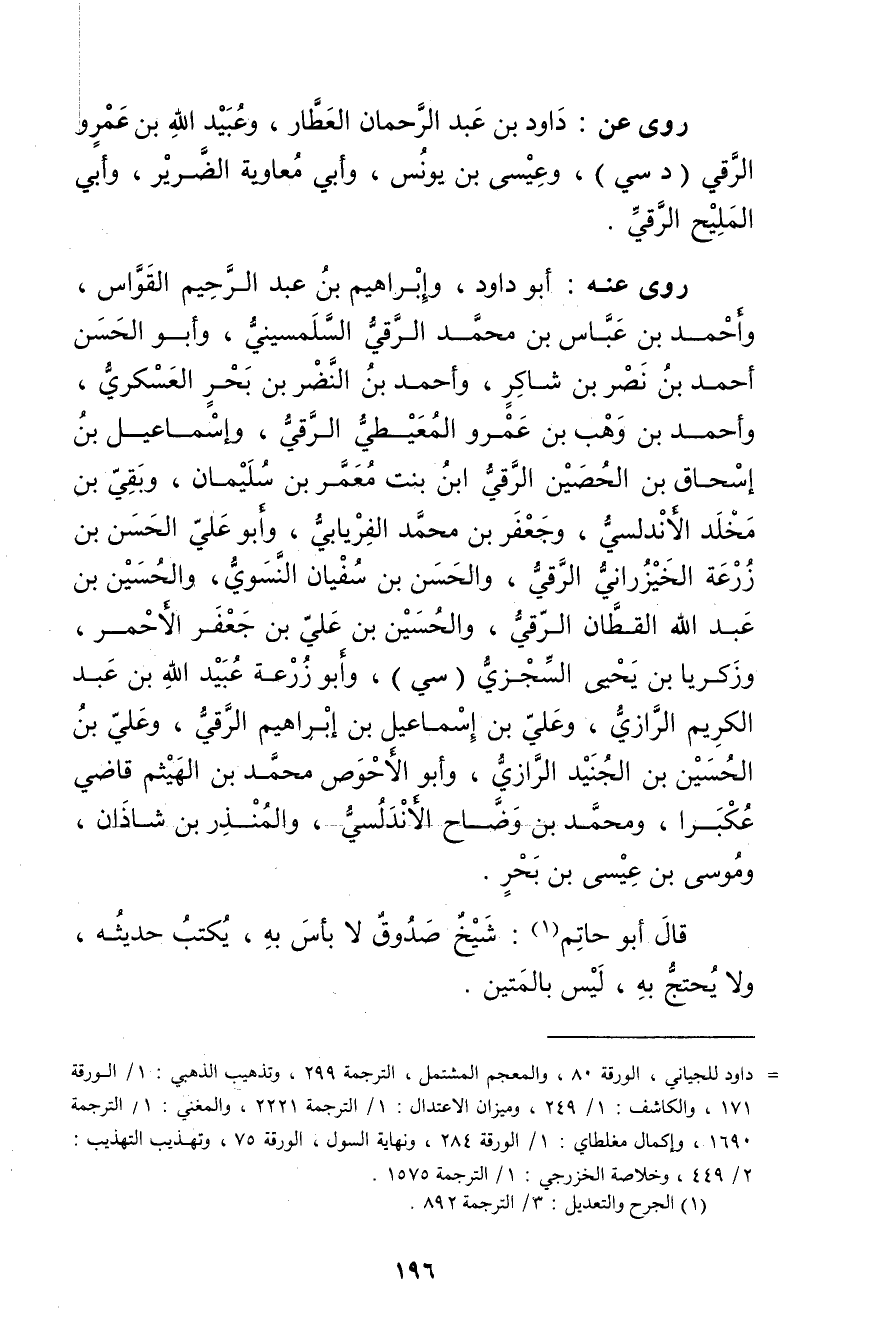 = داود للجياني، الورقة 80، والمعجم المشتمل، الترجمة 299، وتذهيب الذهبي: 1 / الورقة 171، والكاشف: 1 / 249، وميزان الاعتدال: 1 / الترجمة 2221، والمغني: 1 / الترجمة 1690، وإكمال مغلطاي: 1 / الورقة 284، ونهاية السول، الورقة 75، وتهذيب التهذيب: 2 / 449، وخلاصة الخزرجي: 1 / الترجمة 1575.