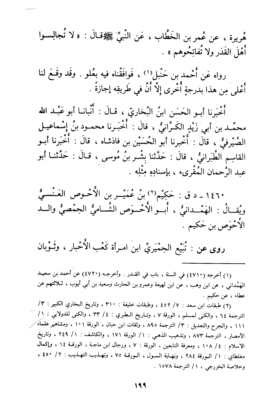 هُرَيْرة، عَنْ عُمَر بْنِ الْخَطَّابِ، عَنِ النَّبِيِّ صلى الله عليه وسَلَّمَ قال: لا تُجَالِسُوا أَهْلَ الْقَدَرِ ولا تُفَاتِحُوهُمْ.