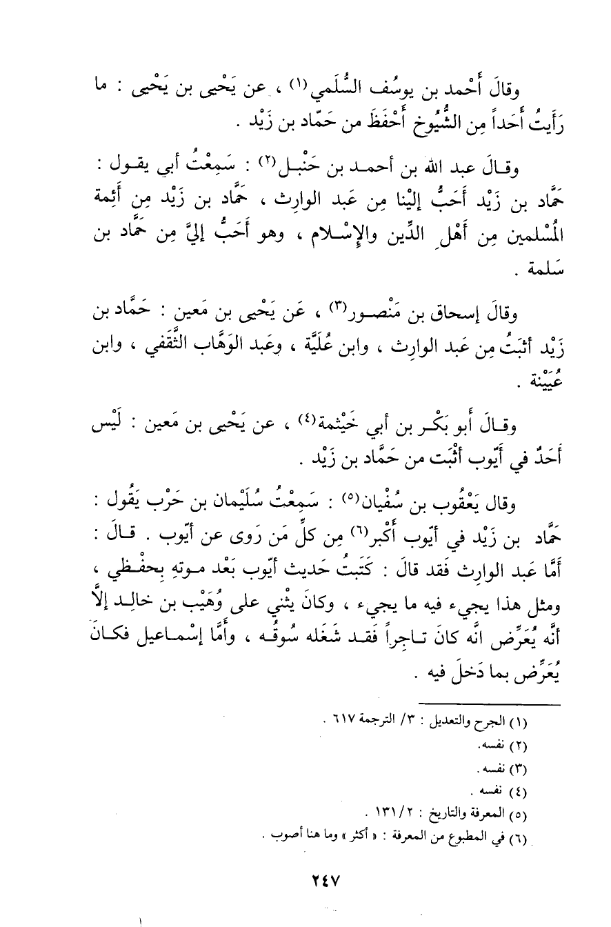 وَقَال يعقوب بن سفيان (5) : سمعت سُلَيْمان بن حرب يقول: حماد بن زيد في أيوب أكبر (6) من كل من روى عن أيوب. قال: أما عبد الوارث فقد قال: كتبت حديث أيوب بعد موته بحفظي، ومثل هذا يجئ فيه ما يجئ، وكان يثني على وهيب بن خالد إلا أنه يعرض أنه كان تاجرا فقد شغله سوقه، وأما إسماعيل فكان يعرض بما دخل فيه.