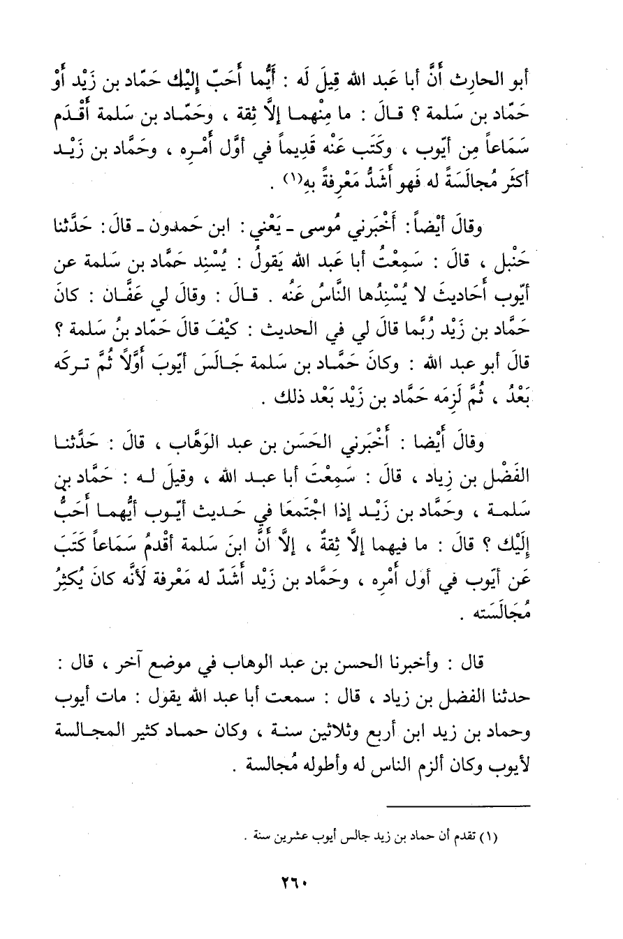 وَقَال أيضا: أَخْبَرَنِي الحسن بن عبد الوهاب، قال: حَدَّثَنَا الفضل بن زياد، قال: سمعت أبا عَبد اللَّهِ، وقيل له: حماد بن سلمة، وحماد بن زيد إذا اجتمعا في حديث أيوب أيهما أحب إليك؟ قال: ما فيهما إلا ثقة، إلا أن ابن سلمة أقدم سماعا كتب عن أيوب في أول أمره، وحماد بن زيد أشد له معرفة لأنه كان يكثر مجالسته.