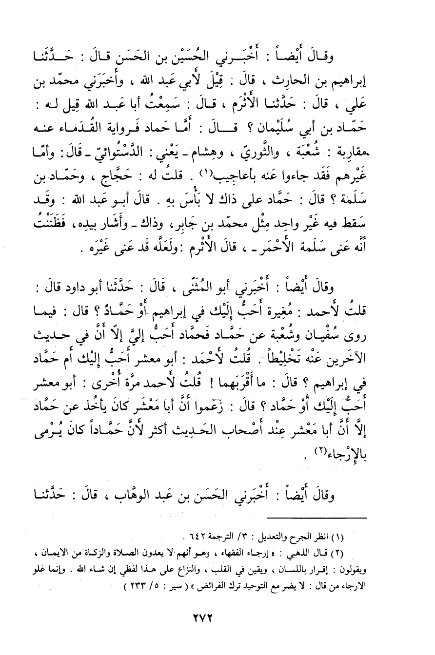وَقَال أيضا: أَخْبَرَنِي أَبُو المثنى، قال: حَدَّثَنَا أَبُو داود قال: قلت لأَحْمَد: مغيرة أحب إليك في إبراهيم أو حماد؟ قال: فيما روى سفيان وشعبة عن حماد فحماد أحب إلي إلا أن في حديث الآخرين عنه تخليطا. قلت لأَحْمَد: أَبُو معشر أحب إليك أم حماد في إبراهيم؟ قال: ما أقربهما! قلت لأَحْمَد مرة أخرى: أَبُو معشر أحب إليك أو حماد؟ قال: زعموا أن أبا معشر كان يأخذ عن حماد إلا أن أبا معشر عند أصحاب الحديث أكثر لأن حمادا كان يرمى بالإرجاء (2) .