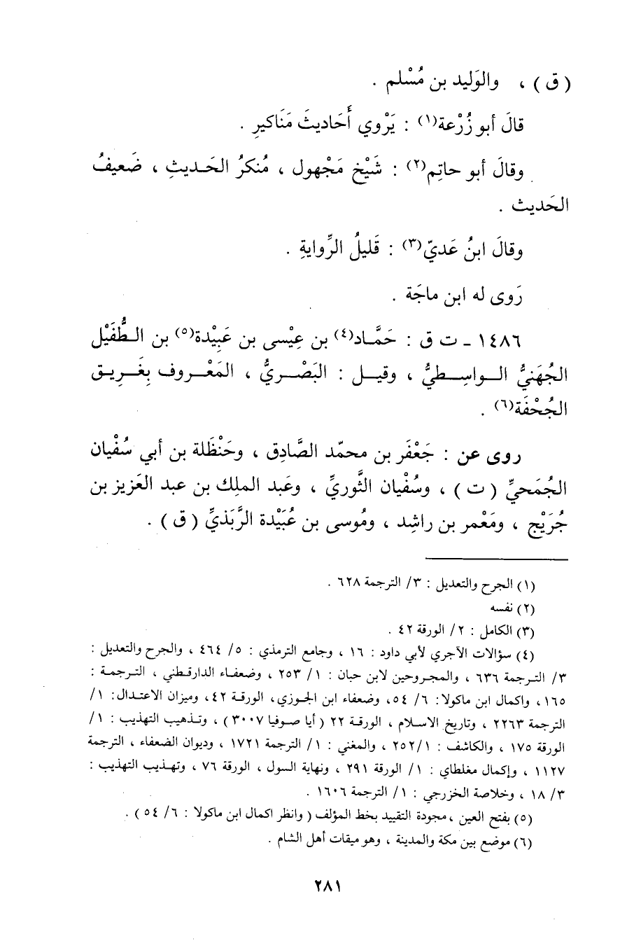 1486 - ت ق: حماد بن عيسى (4) بن عُبَيدة (5) بن الطفيل الجهني الواسطي، وقيل: البَصْرِيّ، المعروف بغريق الجحفة (6) .