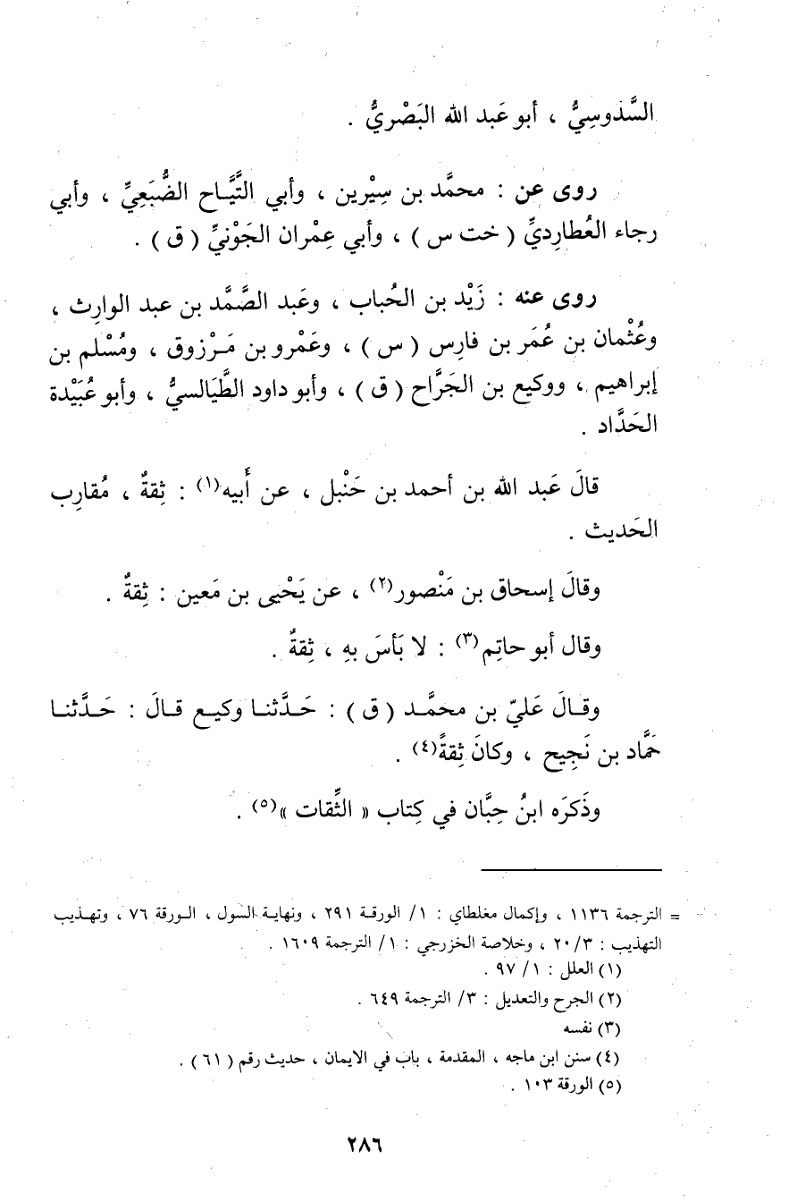 = الترجمة 1136، وإكمال مغلطاي: 1 / الورقة 291، ونهاية السول، الورقة 76، وتهذيب التهذيب: 3 / 20، وخلاصة الخزرجي: 1 / الترجمة 1609.
