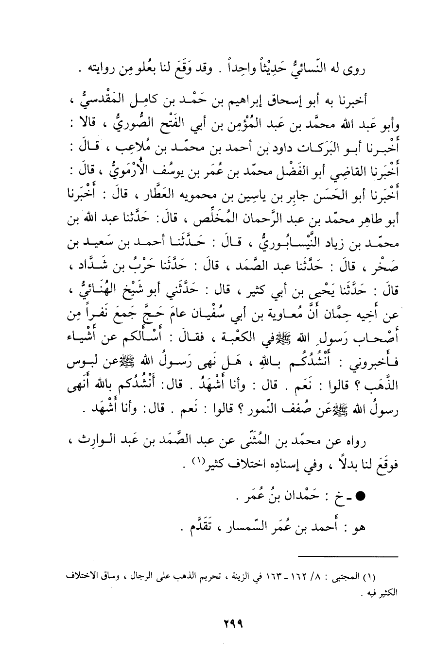 أخبرنا به أَبُو إِسْحَاقَ إِبْرَاهِيمُ بْنُ حَمْدِ بن الكامل الْمَقْدِسِيُّ، وأَبُو عَبْدِ اللَّهِ مُحَمَّدُ بن عبد المؤمن بْنِ أَبي الْفَتْحِ الصُّورِيُّ، قَالا، أَخْبَرَنَا أَبُو الْبَرَكَاتِ دَاوُدُ بْنُ أَحْمَدَ بْنِ مُحَمَّدِ بْنِ مُلاعِبٍ، قال: أَخْبَرَنَا الْقَاضِي أَبُو الْفَضْلِ مُحَمَّدُ بْنُ عُمَر بْنِ يُوسُفَ الأُرْمَوِيُّ، قال: أخبرنا أَبُو الْحَسَنِ جَابِرُ بْنُ يَاسِينَ بْنِ مَحْمَوَيْهِ العطار، قال: أخبرنا أبو طاهي مُحَمَّد بْن عَبْدِ الرَّحْمَنِ المخلص، قال: حَدَّثَنَا عَبد اللَّهِ بْن مُحَمَّدِ بْنِ زِيَادٍ النَّيْسَابُورِيُّ، قال: حَدَّثَنَا أَحْمَدُ بْنُ سَعِيد بْنِ صَخْرٍ، قال: حَدَّثَنَا عَبْدُ الصَّمَدِ، قال: حَدَّثَنَا حرب بْن شداد، قال: حَدَّثَنَا يَحْيَى بْنُ أَبي كَثِيرٍ، قال: حَدَّثَنِي أَبُو شَيْخٍ الْهُنَائِيُّ، عَنْ أَخِيهِ حِمَّانَ أَنَّ مُعَاوِيَةَ بْنَ أَبي سُفْيَانَ عَامَ حَجَّ جَمَعَ نَفَرًا مِنْ أَصْحَابِ رَسُول اللَّهِ صلى الله عليه وسَلَّمَ فِي الْكَعْبَةِ، فَقَالَ: أَسْأَلُكُمْ عَنْ أَشْيَاءَ فَأَخْبِرُونِي: أَنْشُدُكُمْ بِاللَّهِ، هَلْ نَهَى رَسُولُ اللَّهِ صَلَّى اللَّهُ عَلَيْهِ وسَلَّمَ عَنْ لُبُوسِ الذَّهَبِ؟ قَالُوا: نَعَمْ. قال: وأَنَا أَشْهَدُ. قال: أَنْشُدُكُمْ بِاللَّهِ أَنَهَى رَسُول اللَّهِ صلى الله عليه وسلم عن صفف المنور؟ قَالُوا: نَعَمْ. قال: وأَنَا أَشْهَدُ.