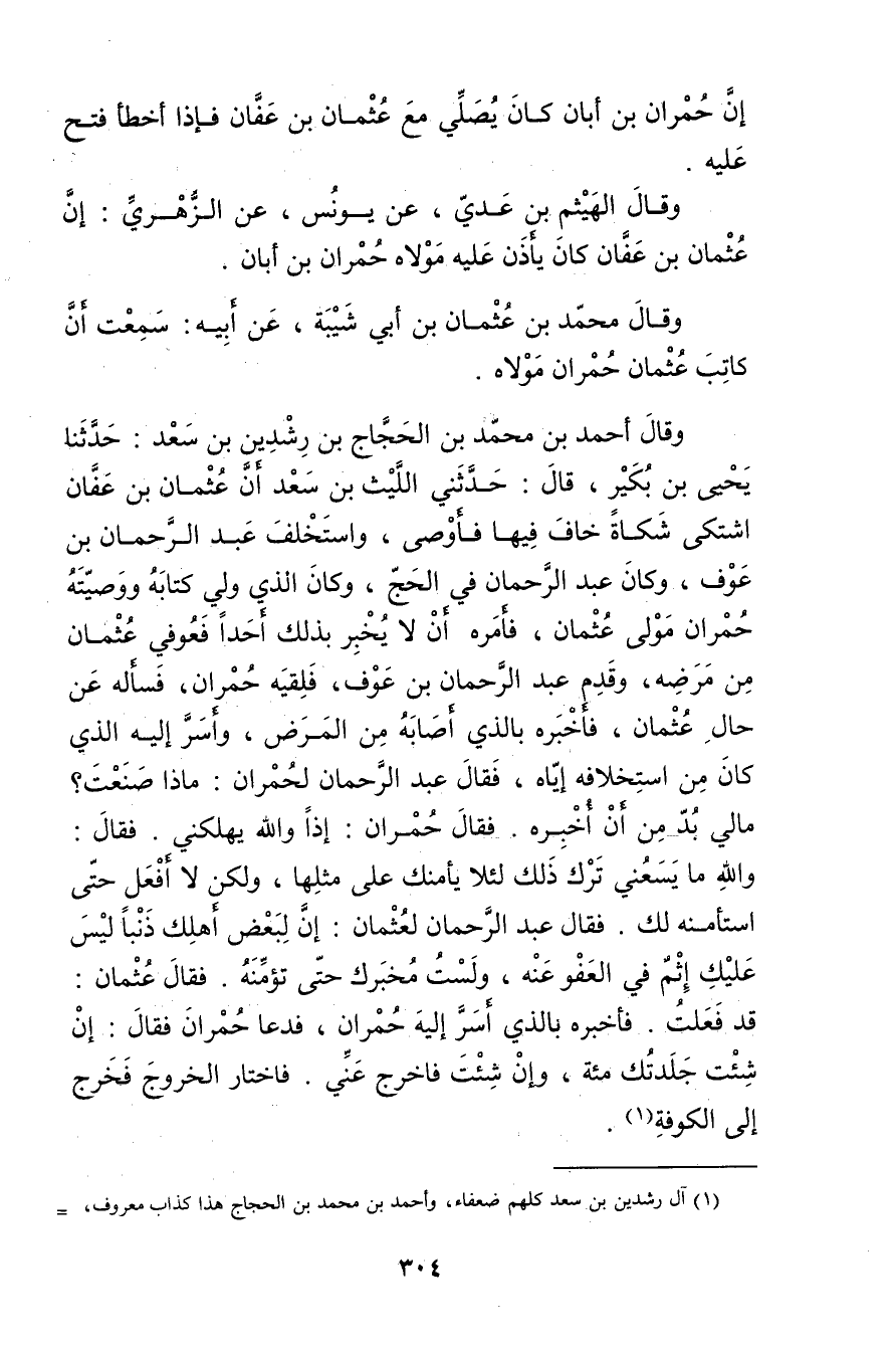 وَقَال أَحْمَد بْن مُحَمَّد بْن الحجاج بْن رشدين بن سعد: حَدَّثَنَا يحيى بْنُ بُكَيْرٍ، قال: حَدَّثَنِي اللَّيْثُ بن سعد أن عثمان بن عفان اشتكى شكاة خاف فيها فأوصى، واستخلف عبد الرحمن بن عوف، وكان عبد الرحمن في الحج، وكان الذي ولي كتابه ووصيته حمران مولى عثمان، فأمره أن لا يخبر بذلك أحدا فعوفي عثمان من مرضه، وقدم عبد الرحمن بن عوف، فلقيه حمران، فسأله عن حال عثمان، فأخبره بالذي أصابه من المرض، وأسر إليه الذي كان من استخلافه إياه، فَقَالَ عبد الرحمن لحمران:ماذا صنعت؟ مالي بد من أخبره. فَقَالَ حمران: إذا والله يهلكني. فَقَالَ: والله ما يسعني ترك ذلك لئلا يأمنك على مثلها، ولكن لا أفعل حتى استأمنه لك.