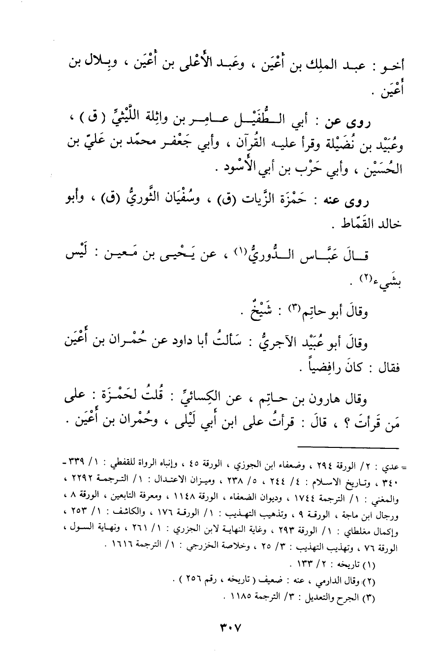 = عدي: 2 / الورقة 249، وضعفاء ابن الجوزي، الورقة 45، وإنباه الرواة للقفطي: 1 / 339 - 340، وتاريخ الاسلام: 4 / 244، 5 / 238، وميزان الاعتدال: 1 / الترجمة 2292، والمغني: 1 / الترجمة 1744، وديوان الضعفاء، الورقة 1148، ومعرفة التابعين، الورقة 8، ورجال ابن ماجة، الورقة 9، وتذهيب التهذيب: 1 / الورقة 176، والكاشف: 1 / 235، وإكمال مغلطاي: 1 / الورقة 293، وغاية النهاية لابن الجزري: 1 / 261، ونهاية السول، الورقة 76، وتهذيب التهذيب: 3 / 25، وخلاصة الخزرجي: 1 / الترجمة 1616.