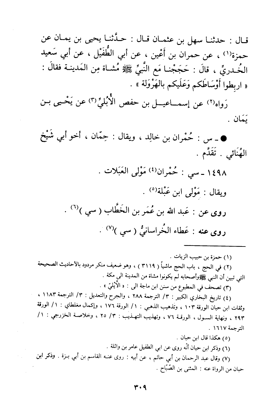 قال: حَدَّثَنَا سَهْلُ بْنُ عُثْمَانَ قال: حَدَّثَنَا يَحْيَى بْنُ يَمَانٍ عَنْ حَمْزَةَ (1) ، عَنْ حُمْرَانَ بْنِ أَعْيَنَ، عَن أَبِي الطُّفَيْلِ، عَن أَبِي سَعِيد الخُدْرِيّ، قال: حَجَجْنَا مع النَّبِيّ صَلَّى اللَّهُ عَلَيْهِ وسَلَّمَ مُشَاةً مِنَ الْمَدِينَةِ فَقَالَ: ارْبِطُوا أَوْسَاطَكُمْ وعَلَيْكُمْ بِالْهَرْوَلَةِ.