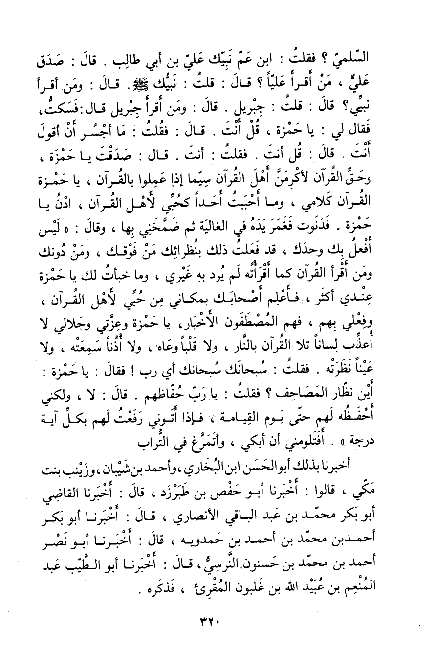 السلمي؟ فقلت: ابن عم نبيك عَلِيّ بْن أَبي طالب. قال: صدق علي، من أقرأ عليا؟ قال: قلت: نبيك صَلَّى اللَّهُ عَلَيْهِ وسَلَّمَ. قال: ومن أقرأ نبيي؟ قال: قلت: جبريل. قال: من أقرأ جبريل قال: فسكت، فَقَالَ لي: يا حمزة، قل أنت. قال: فقلت: ما أجسر أن أقول أنت. قال: قل أنت. فقلت: أنت. قال: صدقت يا حمزة، وحق القرآن لأكرمن أهل القرآن سيما إذا عملوا بالقرآن، يا حمزة القرآن كلامي، وما أحببت أحدا كحبي لأهل القرآن، ادن يا حمزة. فدنوت فغمر يده في الغالية ثم ضمخني بها، وَقَال: ليس أفعل بك وحدك، قد فعلت ذلك بنظرائك من وفوقك، ومن دونك ومن أقرأ القرآن كما أقرأته لم يرد به غيري، وما خبأت لك يا حمزة عندي أكثر، فأعلم أصحابك بمكاني من حبي لأهل القرآن، وفعلي بهم، فهم المصطفون الأخيار، يا حمزة وعزتي وجلالي لا أعذب لسانا تلا القرآن بالنار، ولا قلبا وعاه، ولا أذنا سمعته، ولا عينا نظرته. فقلت: سبحانك سبحانك أبي رب! فَقَالَ: يا حمزة أين نظار المصاحف؟ فقلت: يا رب حفاظهم. قال: لا، ولكني أحفظه لهم حتى يوم القيامة، فإذا أتوني رفعت لهم بكل آية درجة". أفتلو مني أن أبكي، وأتمرغ في التراب.