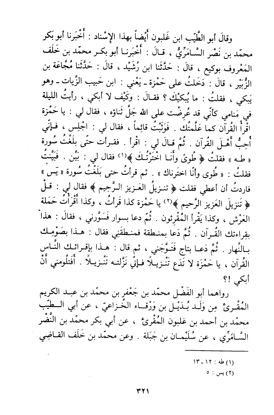 وَقَال أبو الطيب ابن غلبون أيضا بهذا الإسناد: أَخْبَرَنَا أَبُو بكر مُحَمَّد بن نصر السامري، قال: أَخْبَرَنَا أَبُو بكر مُحَمَّد بن خلف المعروف بوكيع، قال: حَدَّثَنَا ابن رشيد، قال: حَدَّثَنَا مجاعة بن الزبير، قال: دخلت على حمزة، يعني: ابن حبيب الزيات - وهو يبكي، فقلت: ما يبكيك؟ فَقَالَ: وكيف لا أبكي، رأيت الليلة في منامي كأني قد عرضت على الله جل ثناؤه، فَقَالَ لي: يا حمزة اقرأ القرآن كما علمتك. فوثبت قائما، فَقَالَ لي: اجلس، فإني أحب أهل القرآن. ثم قال لي: اقرأ. فقرأت حتى بلغت سورة"طه"فقلت {طوى وأنا اخترتك) {1) فَقَالَ لي: بين. فبينت فقلت: طوى وأنا اخترناك". ثم قرأت حتى بلغت سورة"يس"فأردت أن أعطي فقلت {تنزيل العزيز الرحيم} فَقَالَ لي: قل {تنزيل العزيز الرحيم) {2) يا حمزة كذا قرأت، وكذا أقرأت حملة العرش، وكذا يقرأ المقرئون. ثم دعا بسوار فسورني، فَقَالَ: هذا بقراءتك القرآن. ثم دعا بمنطفة فمنطقني فَقَالَ: هذا بصومك بالنهار. ثم دعا بتاج فتوجني، ثم قال: هذا بإقرائك الناس القرآن، يا حمزة لا تدع تنزيلا فإني نزلته تنزيلا. أفتلومني أن أبكي؟ !