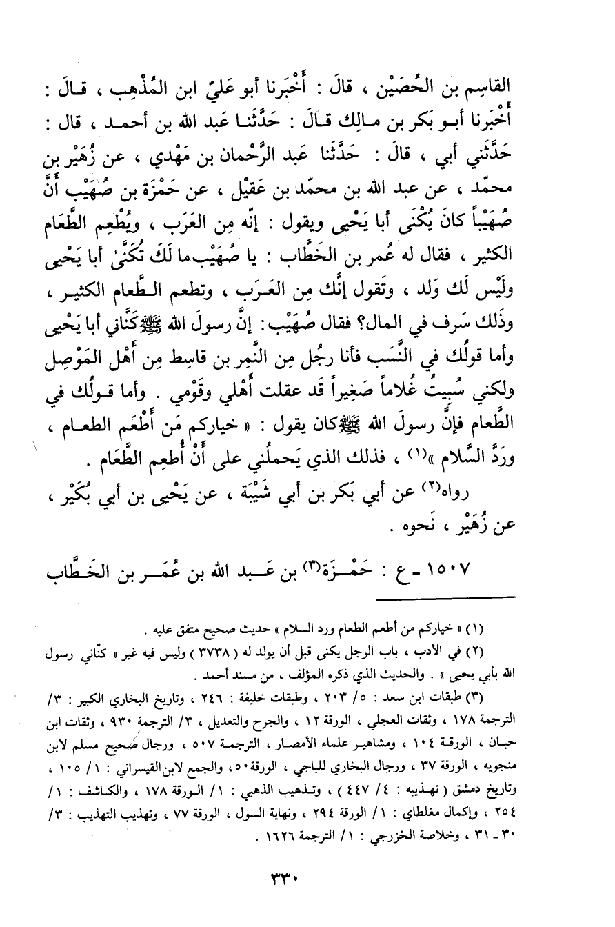 القاسم بْن الحصين، قال: أَخْبَرَنَا أَبُو عَلِيِّ ابْنُ الْمُذْهِب، قال: أَخْبَرَنَا أبو بكر بْن مالك قال: حَدَّثَنَا عَبد اللَّهِ بْن أَحْمَدَ، قال: حَدَّثني أبي، قال: حَدَّثَنَا عَبْد الرحمن بْن مهدي، عَنْ زُهَيْرِ بْنِ مُحَمَّدِ، عَنْ عَبد اللَّهِ بْن مُحَمد بْن عَقِيل، عَنْ حَمْزَةَ بْنِ صُهَيْبٍ أَنَّ صُهَيْبًا كَانَ يُكْنَى أَبَا يَحْيَى ويَقُولُ: إِنَّهُ مِنَ الْعَرَبِ، ويُطْعِمُ الطَّعَامَ الْكَثِيرَ، فَقَالَ لَهُ عُمَر بْنُ الْخَطَّابِ: يَا صُهَيْبُ ما لك تُكْنَى أَبَا يَحْيَى ولَيْسَ لَكَ ولَدٌ، وتَقُولُ إِنَّكَ مِنَ الْعَرَبِ، وتُطْعِمُ الطَّعَامَ الْكَثِيرَ، وذَلِكَ سَرَفٌ فِي الْمَالِ؟ فَقَالَ صُهَيْبٌ: إِنَّ رَسُول اللَّهِ صلى الله عليه وسَلَّمَ كَنَّانِي أَبَا يَحْيَى وأَمَّا قَوْلُكَ فِي النَّسَبِ فَأَنَا رَجُلٌ مِنَ النَّمِرِ بْنِ قَاسِطٍ مِنْ أَهْلِ الْمَوْصِلِ ولَكِنِّي سُبِيتُ غُلامًا صَغِيرًا قَدْ عَقَلْتُ أَهْلِي وقَوْمِي. وأَمَّا قَوْلُكَ فِي الطَّعَامِ فَإِنَّ رَسُول اللَّهِ صلى الله عليه وسَلَّمَ كَانَ يَقُولُ: خِيَارُكُمْ مَنْ أَطْعَمَ الطَّعَامَ، ورَدَّ السَّلامَ" (1) ، فَذَلِكَ الَّذِي يَحْمِلُنِي عَلَى أَنْ أُطْعِمَ الطَّعَامَ.