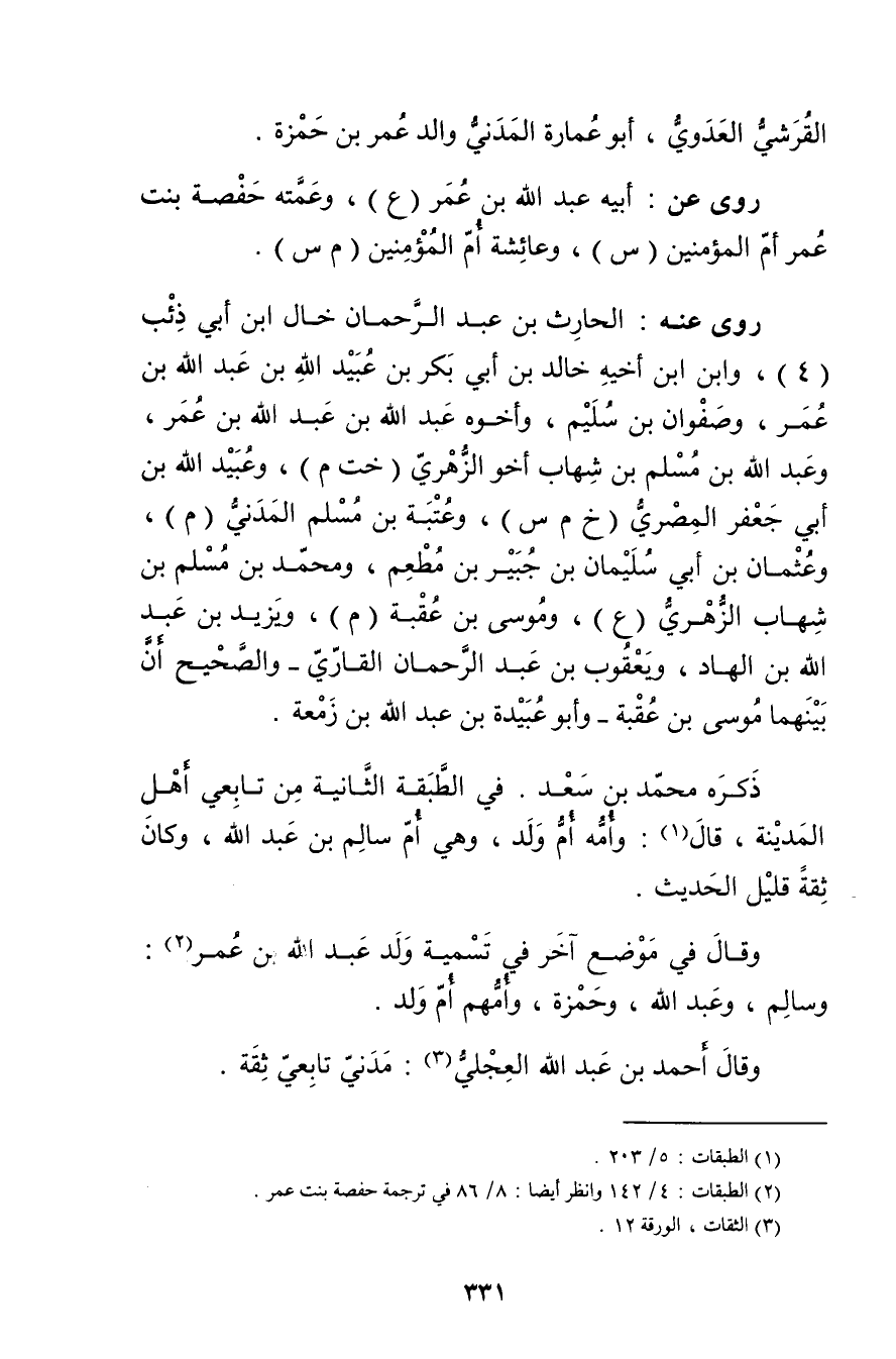 (2) الطبقات: 4 / 142، وانظر أيضا: 8 / 86 في ترجمة حفصة بنت عُمَر.