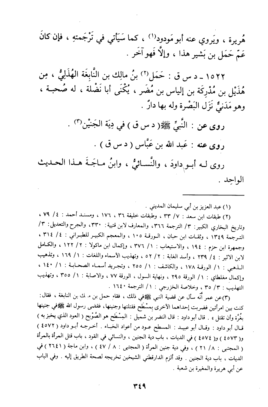 1522 - د س ق: حمل بن مالك بن النابغة الهذلي (2) ، من هذيل بن مدركة بن إلياس بن مضر، يكنى أبا نضلة، لهُ صُحبَةٌ، وهو مدني نزل البصرة وله بها دار.