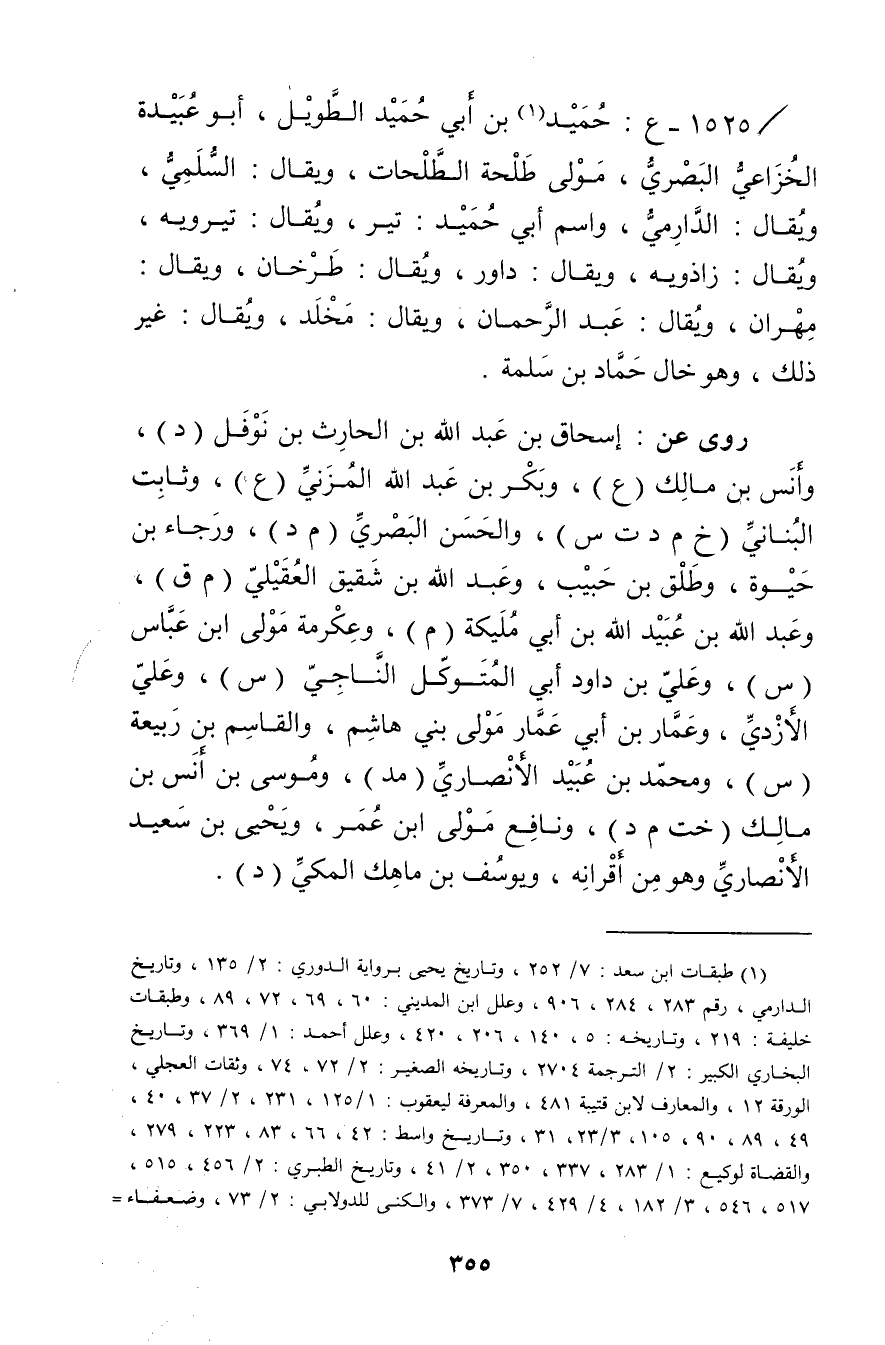 1525 - ع: حميد بن أَبي حميد الطويل (1) ، أَبُو عُبَيدة الخزاعي البَصْرِيّ، مولى طلحة الطلحات، ويُقال: السلمي، ويُقال: الدارمي، واسم أبي حميد: تير، ويُقال: تيرويه، ويُقال: زاذويه، ويُقال: داور، ويُقال: طرخان، ويُقال: مهران، ويُقال: عبد الرحمن، ويُقال: مخلد، ويُقال: غير ذلك، وهو خال حماد بن سلمة.