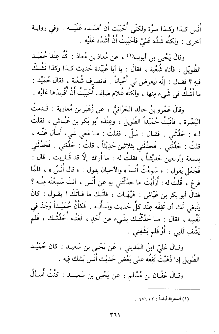 فَقَالَ: سل: فقلت: ما معي شيء أسأل عنه، قلت: حَدَّثَنِي. فحَدَّثَنِي بثلاثين حديثا، قلت: حَدَّثَنِي. فحَدَّثَنِي بتسعة وأربعين حديثا، فقلت له: ما أراك إلا قد قاربت. قال: فجعل يقول: سمعت أنسا"والأحيان يقول: قال أنس"، فلما فرغ، قلت له: أرأيت ما حدثتني به عن أنس، أنت سمعته منه؟ فَقَالَ أَبُو بكر بن عياش: هيهات، فاتك ما فاتك! يقول: كان ينبغي لك أن تقفه عند كل حديث وتسأله. فكأن حميدا وجد في نفسه، فَقَالَ: ما حدثتك بشيءٍ عن أحد، فعنه أحدثك، فلم يشف قلبي، أو فلم يشفني.