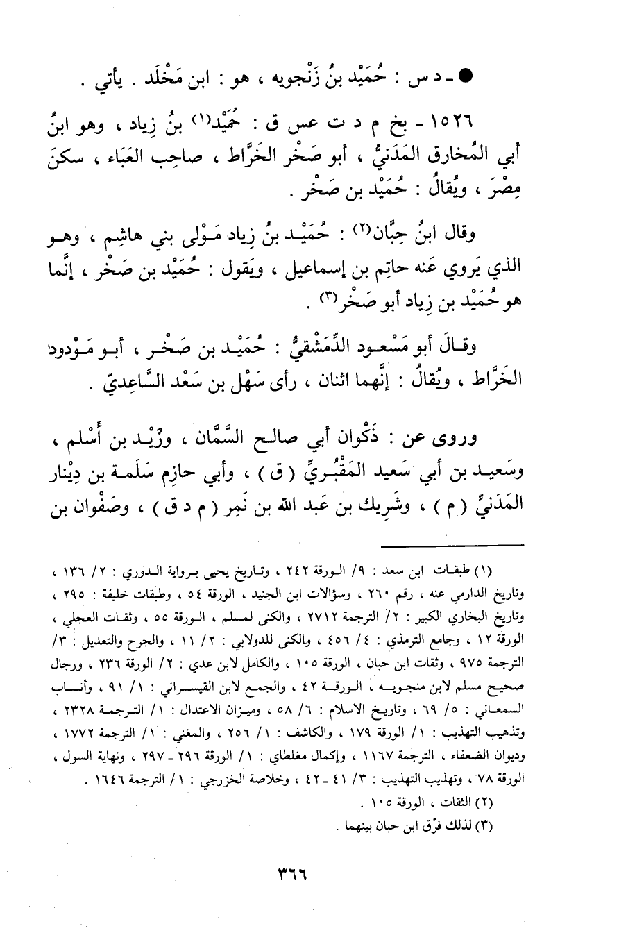 1526 - بخ م د ت عس ق: حميد بن زياد (1) ، وهو ابن أَبي المخارق المدني، أَبُو صخر الخراط، صاحب العباء، سكن مصر، ويُقال: حميد بن صخر.
