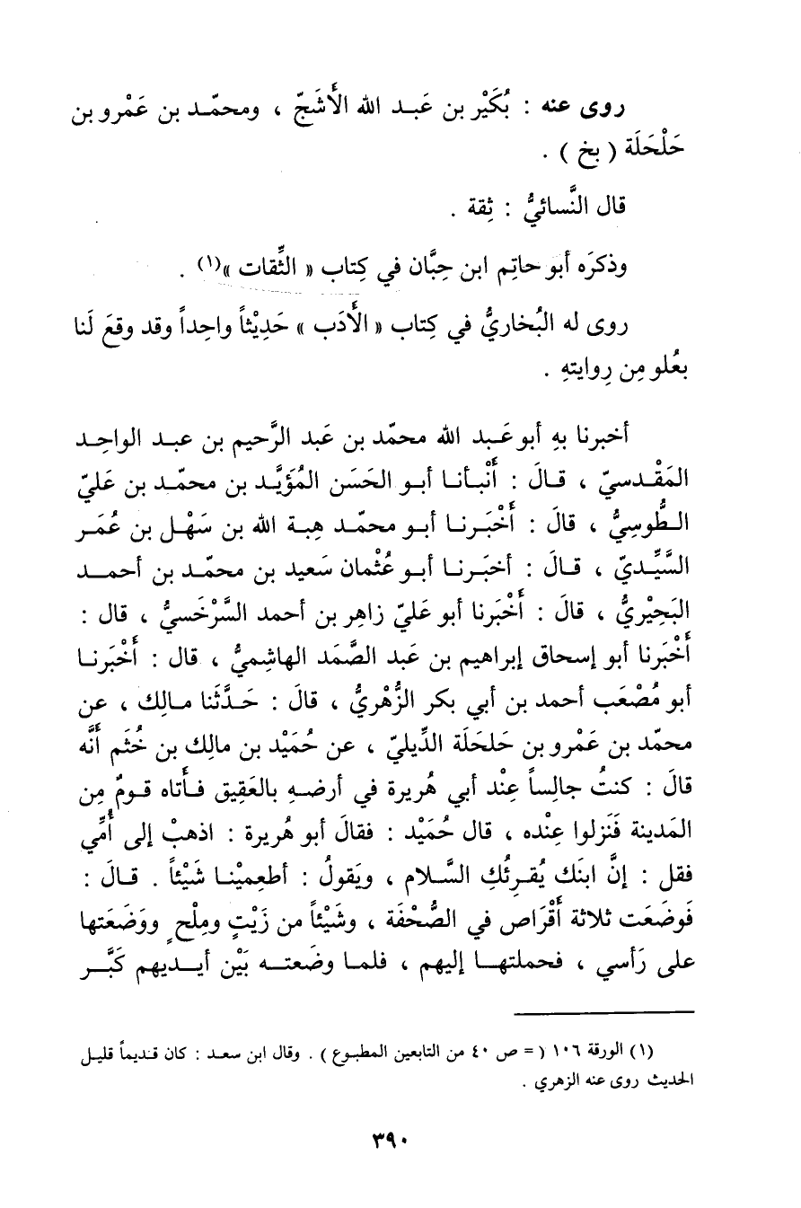 أَخْبَرَنَا بِهِ أَبُو عَبْدِ اللَّهِ مُحَمَّدُ بْنُ عَبد الرَّحِيمِ بْن عَبْد الواحد المقدسي، قال: أَنْبَأَنَا أَبُو الْحَسَنِ الْمُؤَيَّدُ بْنُ مُحَمَّدِ بْن عَلِيٍّ الطوسي، قال: أَخْبَرَنَا أَبُو مُحَمَّدٍ هِبَةُ اللَّهِ بن سهل بن عُمَر السيدي، قال: أَخْبَرَنَا أَبُو عثمان سَعِيد بن مُحَمَّد بن أَحْمَد البحيري، قال: أَخْبَرَنَا أَبُو علي زاهر بن أَحْمَد السرخسي، قال: أَخْبَرَنَا أَبُو إِسْحَاقَ إِبْرَاهِيمُ بْنُ عَبْدِ الصمد الهاشمي، قال: أَخْبَرَنَا أَبُو مصعب أَحْمَد بْن أَبي بَكْر الزُّهْرِيّ، قال: حَدَّثَنَا مالك، عن مُحَمَّد بن عَمْرو بن حلحلة الديلي، عن حميد بن مالك بن خثم أنه قال: كنت جالسا عند أبي هُرَيْرة في أرضه بالعقيق فأتاه قوم من المدينة فنزلوا عنده، قال حميد: فَقَالَ أَبُو هُرَيْرة: اذهب إلى أمي فقل: إن ابنك يقرئك السلام، ويقول: أطعمينا شيئا. قال: فوضعت ثلاثة أقراص في الصحفة، وشيئامن زيت وملح ووضعتها على رأسي، فحملتها إليهم، فلما وضعته بين أيديهم كبر