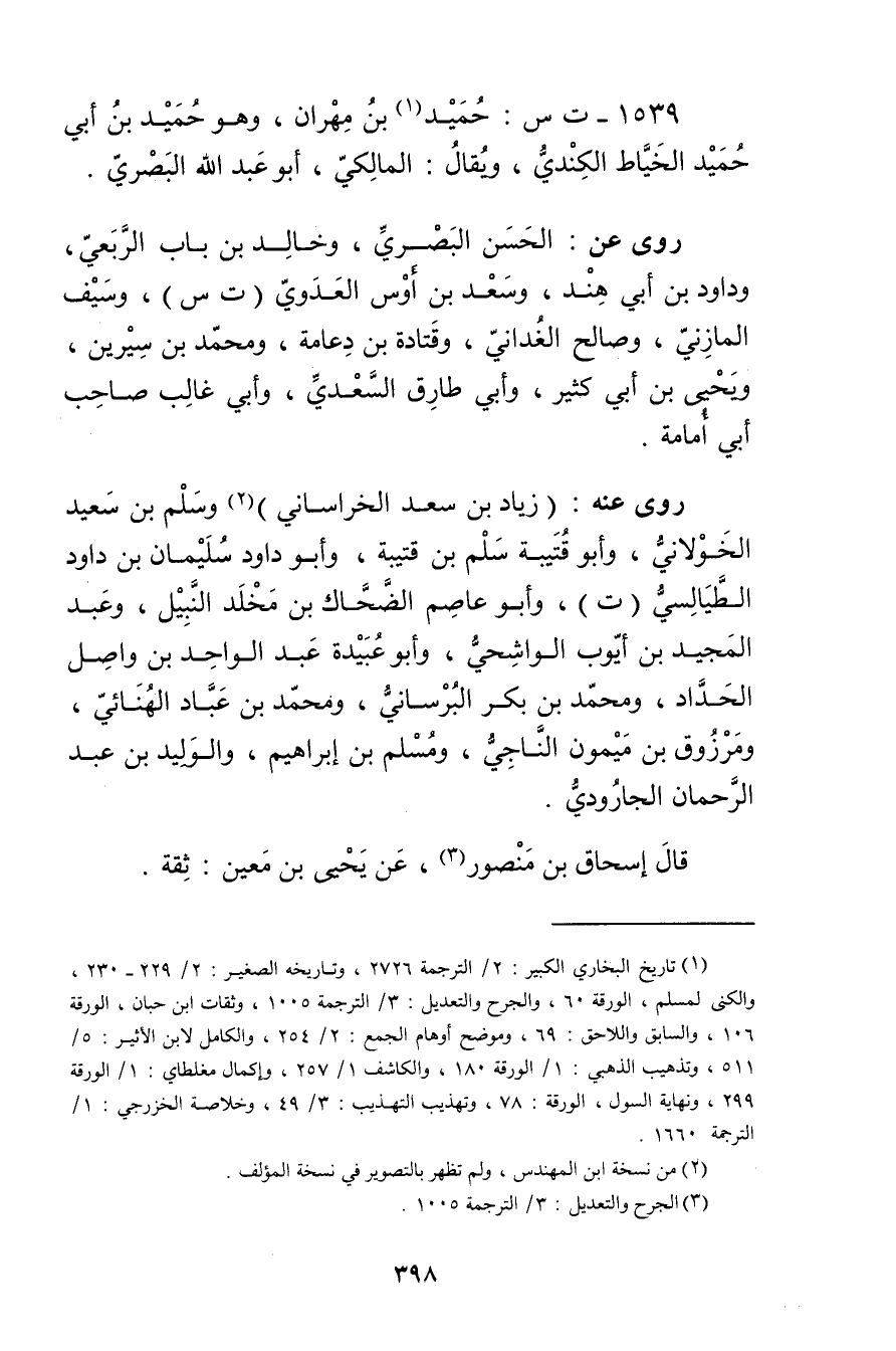1539 - ت س: حميد بن مهران (1) ، وهو حميد بن أَبي حميد الخياط الكندي، ويُقال: المالكي، أَبُو عَبْد اللَّهِ البَصْرِيّ.