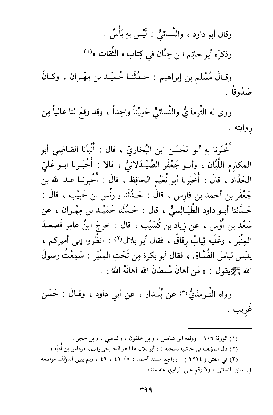 أَخْبَرَنَا بِهِ أَبُو الْحَسَنِ بْنُ الْبُخَارِيِّ، قال: أَنْبَأَنَا الْقَاضِي أَبُو الْمَكَارِمِ اللَّبَّانُ، وأَبُو جعفر الصيدلاني، قالا: أخبرنا أَبُو عَلِيّ الحداد، قال: أَخْبَرَنَا أَبُو نُعَيْمٍ الْحَافِظُ، قال: أَخْبَرَنَا عَبْدُ اللَّهِ بْن جَعْفَر بْن أَحْمَد بْنِ فَارِسٍ، قال: حَدَّثَنَا يُونُسُ بْنُ حَبِيبٍ، قال: حَدَّثَنَا أَبُو دَاوُدَ الطَّيَالِسِيُّ، قال: حَدَّثَنَا حُمَيْدُ بْنُ مِهْرَانَ، عَنْ سَعْدِ بْنِ أَوْسٍ، عَنْ زِيَادِ بْنِ كُسَيْبٍ، قال: خَرَجَ ابْنُ عَامِرٍ فَصَعَدَ الْمِنْبَرَ، وعَلَيْهِ ثِيَابٌ رِقَاقٌ، فَقَالَ أَبُو بِلالٍ (2) : انْظُرُوا إِلَى أَمِيرِكُمْ، يَلْبَسُ لِبَاسَ الْفُسَّاقِ، فَقَالَ أَبُو بَكْرَةَ مِنْ تَحْتِ الْمِنْبَرِ: سَمِعْتُ رَسُول اللَّهِ صلى الله عليه وسَلَّمَ يَقُولُ: مَنْ أَهَانَ سُلْطَانَ اللَّهِ أَهَانَهُ اللَّهُ.