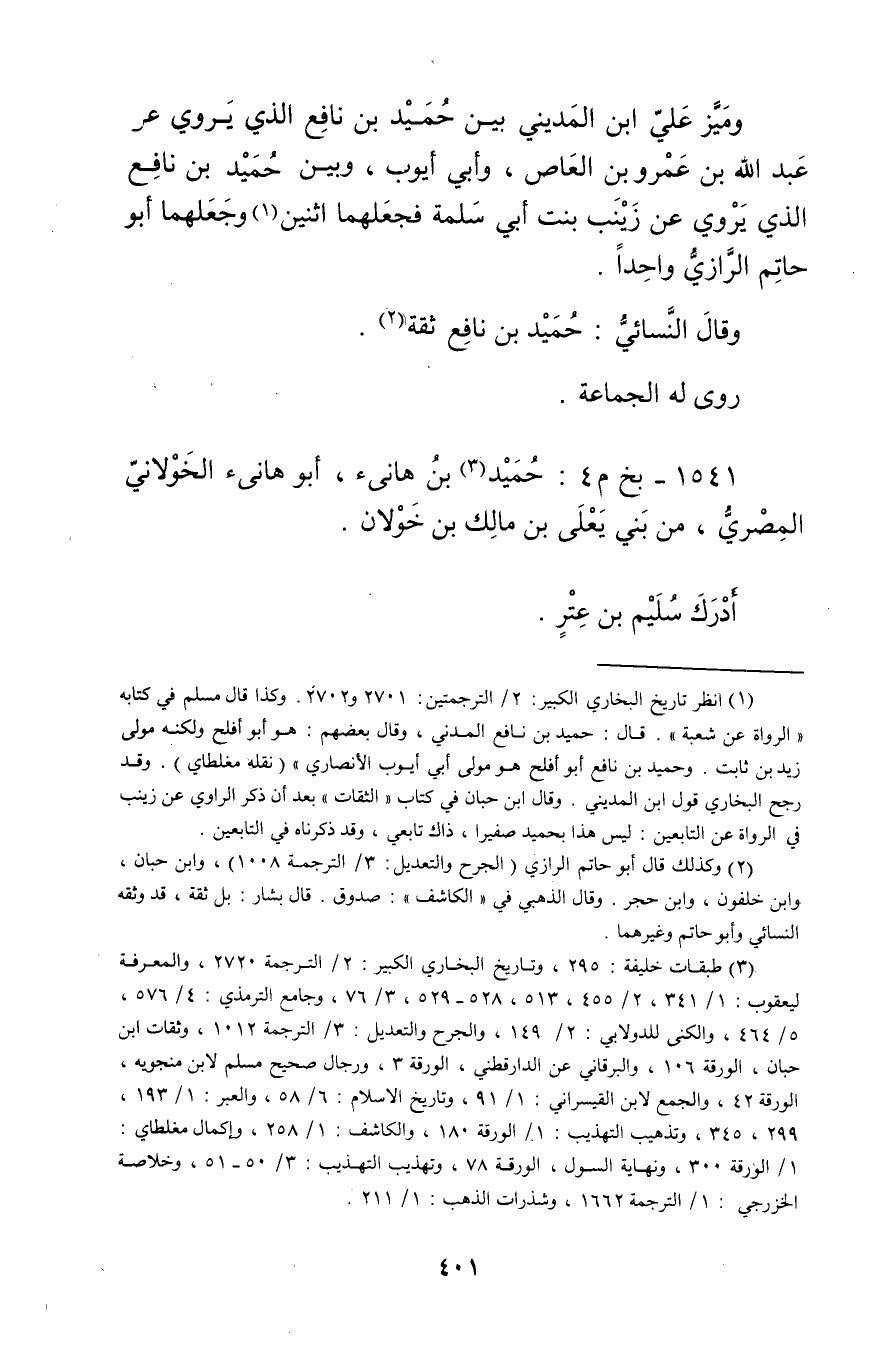 وميز علي ابن المديني بين حميد بن نافع الذي يروي عَنْ عَبد اللَّهِ بْن عَمْرو بن العاص، وأبي أيوب، وبين حميد بن نافع الذي يروي عن زينب بنت أبي سلمة فجعلهما اثنين (1) وجعلهما أَبُو حاتم الرازي واحدا.