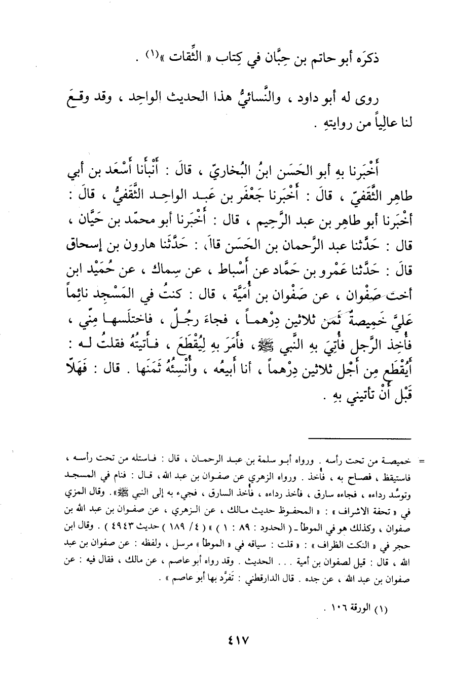 أَخْبَرَنَا بِهِ أَبُو الْحَسَنِ بْنُ الْبُخَارِيِّ، قال: أَنْبَأَنَا أَسْعَدُ بْنُ أَبي طَاهِرٍ الثَّقَفِيُّ، قال: أَخْبَرَنَا جَعْفَرُ بْنُ عَبْدِ الْوَاحِدِ الثَّقَفِيُّ، قال: أَخْبَرَنَا أَبُو طَاهِرِ بْنُ عَبد الرَّحِيمِ، قال: أَخْبَرَنَا أَبُو مُحَمَّدِ بْنُ حَيَّانَ، قال: حَدَّثَنَا عَبْد الرحمن بْن الْحَسَنِ قال: حَدَّثَنَا هَارُونُ بْنُ إِسْحَاقَ قال: حَدَّثَنَا عَمْرو بْنُ حَمَّادٍ عَنْ أَسْبَاطٍ، عَنْ سِمَاكٍ، عَنْ حُمَيْدِ ابْنِ أُخْتِ صَفْوَانَ، عَنْ صَفْوَانَ بْنِ أُمَيَّةَ، قال: كُنْتُ فِي الْمَسْجِدِ نَائِمًا عَلَيَّ خَمِيصَةٌ ثَمَنَ ثَلاثِينَ دِرْهَمًا، فَجَاءَ رَجُلٌ، فَاخْتَلَسَهَا مِنِّي، فَأُخِذَ الرَّجُلُ فَأُتِيَ بِهِ النَّبِيُّ صَلَّى اللَّهُ عَلَيْهِ وسَلَّمَ، فَأَمَرَ بِهِ لِيُقْطَعَ، فَأَتَيْتُهُ فَقُلْتُ لَهُ: أَيُقْطَعُ مِنْ أَجْلِ ثَلاثِينَ دِرْهَمًا، أَنَا أَبِيعُهُ، وأنسئه ثمنها. قال: فَهَلا قَبْلَ أَنْ تَأْتِيَنِي به.