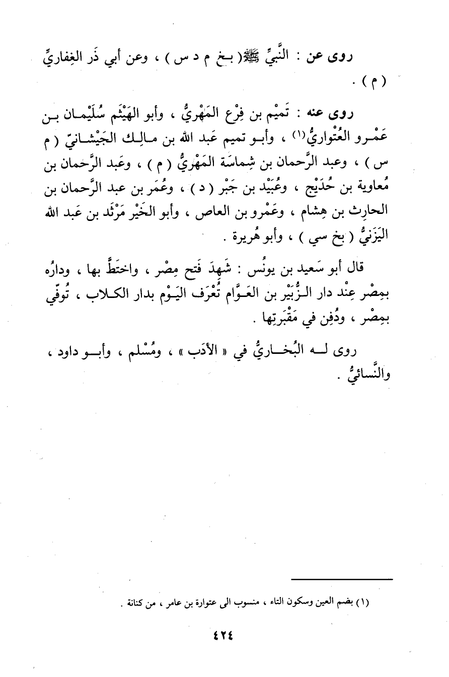 رَوَى عَن: النَّبِيّ صَلَّى اللَّهُ عَلَيْهِ وسَلَّمَ (بخ م د س) ، وعَن أبي ذر الغفاري (م) .