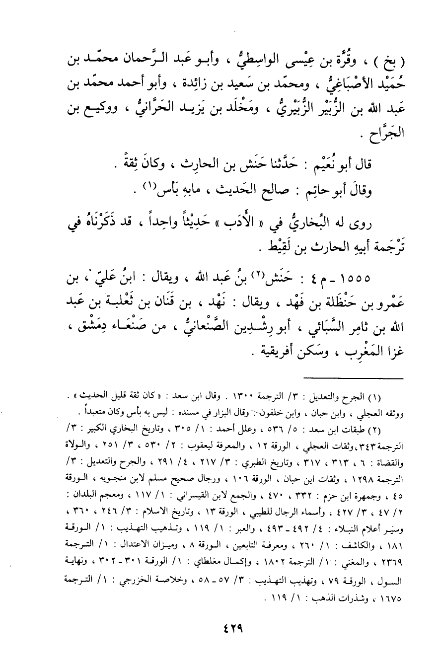(2) طبقات ابن سعد: 5 / 536، وعلل أحمد: 1 / 305، وتاريخ البخاري الكبير: 3 / الترجمة 343، وثقات العجلي، الورقة 12، والمعرفة ليعقوب: 2 / 530، 3 / 251، والولاة والقضاة: 6، 313، 317، وتاريخ الطبري: 3 / 217، 4 / 291، والجرح والتعديل: 3 / الترجمة 1298، وثقات ابن حبان، الورقة 106، ورجال صحيح مسلم لابن منجويه، الورقة 45، وجمهرة ابن حزم: 332، 470، والجمع لابن القيسراني: 1 / 117، ومعجم البلدان: 2 / 47، 3 / 427، وأسماء الرجال للطيبي، الورقة 13، وتاريخ الاسلام: 3 / 246، 360، وسير أعلام النبلاء: 4 / 492 - 493، والعبر: 1 / 119، وتذهيب التهذيب: 1 / الورقة 181، والكاشف: 1 / 260، ومعرفة التابعين، الورقة 8، وميزان الاعتدال: 1 / الترجمة 2369، والمغني: 1 / الترجمة 1802، وإكمال مغلطاي: 1 / الورقة 301 - 302، ونهاية السول، الورقة 79، وتهذيب التهذيب: 3 / 57، 58، وخلاصة الخزرجي: 1 / الترجمة 1675، وشذرات الذهب: 1 / 119.