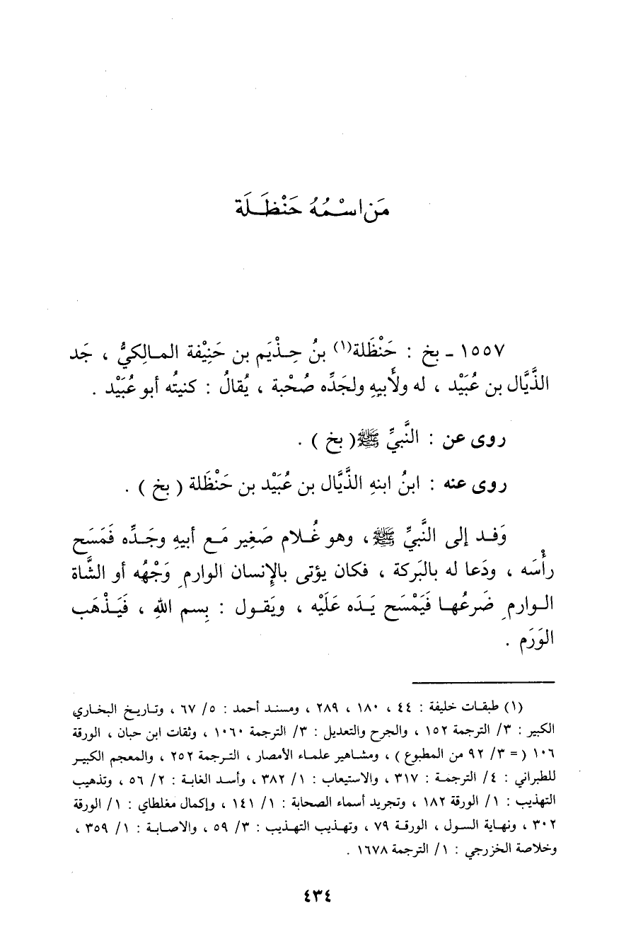 1557 - بخ: حنظلة بن حذيم بن حنيفة المالكي (1) ، جد الذيال بن عُبَيد، له ولأبيه ولجده صحبة، يقال: كنيته أَبُو عُبَيد.