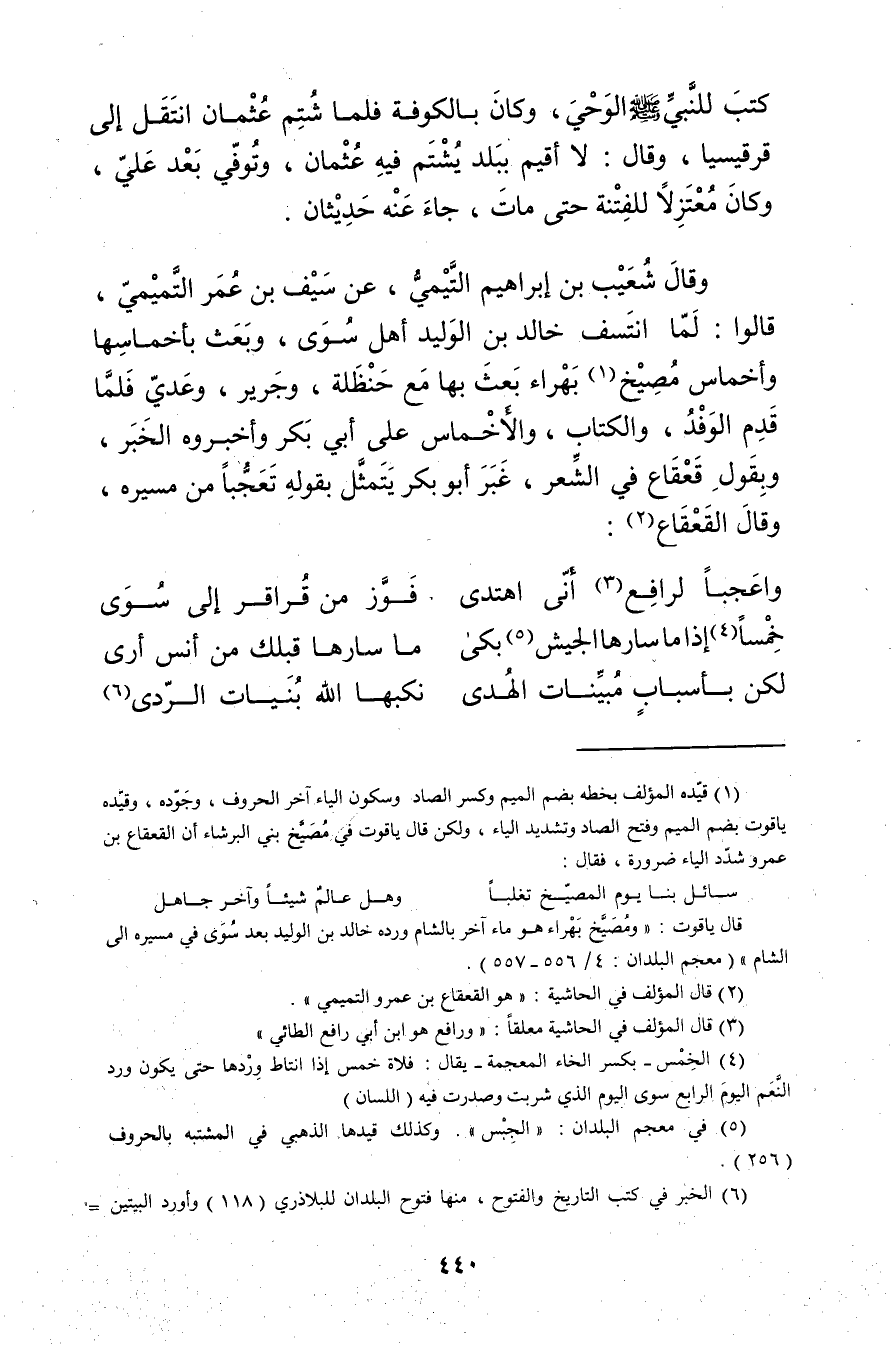 (1) قيده المؤلف بخطه بضم الميم وكسر الصاد وسكون الياء آخر الحروف، وجوده، وقيده ياقوت بضم الميم وفتح الصاد وتشديد الياء، ولكن قال ياقوت في مصيخ بني البرشاء أن القعقاع بن عَمْرو شدد الياء ضرورة، فقال: سائل بنا يوم المصيخ تغلبا • وهل عالم شيئا وآخر جاهل قال ياقوت: ومصيخ بهراء هو ماء آخر بالشام ورده خالد بن الوليد بعد سوى في مسيره إلى الشام" (معجم البلدان: 4 / 556 - 557) .