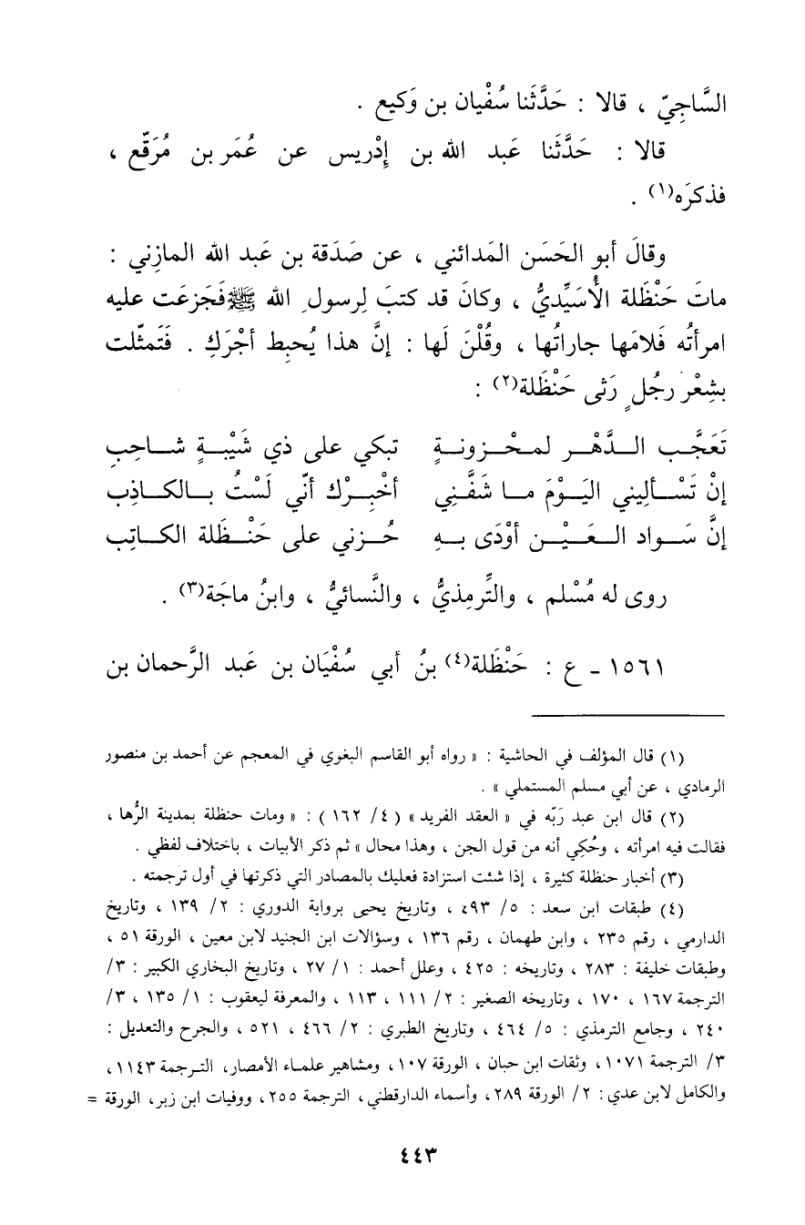 (3) أخبار حنظلة كثيرة، إذا شئت استزادة فعليك بالمصادر التي ذكرتها في أول ترجمته.