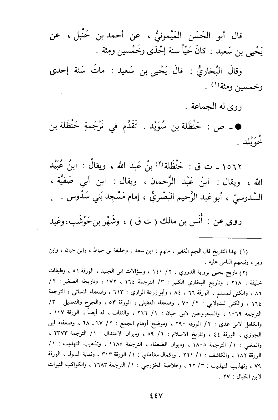 1562 - ت ق: حنظلة بن عَبد اللَّهِ (2) ، ويُقال: ابن عُبَيد الله، ويُقال: ابن عبد الرحمن، ويُقال: ابن أَبي صفية، السدوسي، أَبُو عبد الرحيم البَصْرِيّ، إمام مسجد بني سدوس.