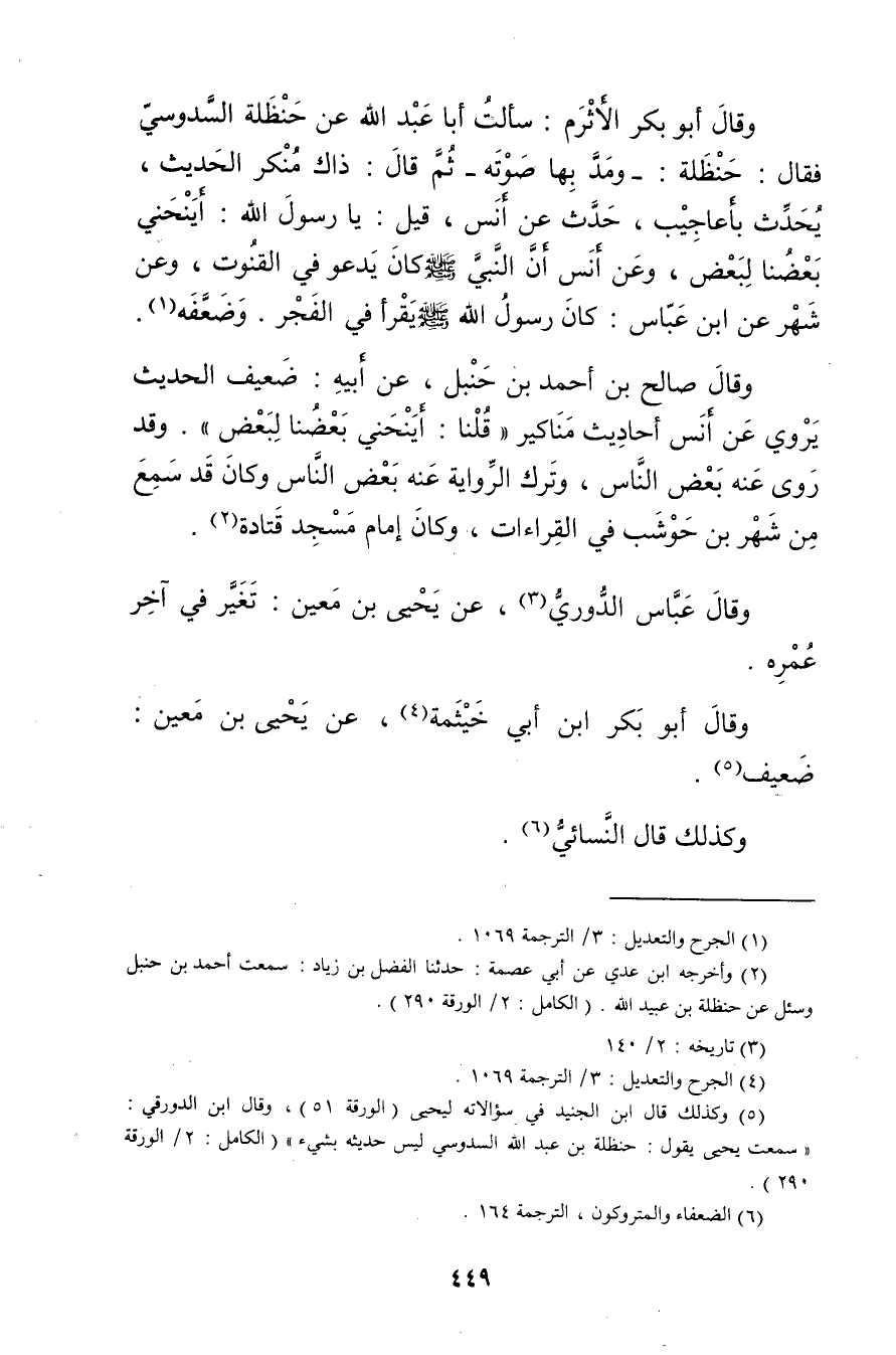 (5) وكذلك قال ابن الجنيد في سؤالاته ليحيى (الورقة 51) ، وَقَال ابن الدورقي: سمعت يحيى يقول: حنظلة بن عَبد الله السدوسي ليس حديثه بشيءٍ" (الكامل: 2 / الورقة 290) .