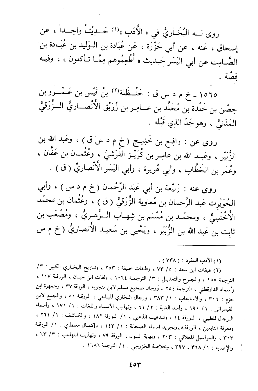 1565 - خ م د س ق: حنظلة بن قيس بن عَمْرو بن حصن بن خلدة بن مخلد بن عامر بن زريق الأَنْصارِيّ الزرقي المدني (2) ، وهو جد الذي قبله.