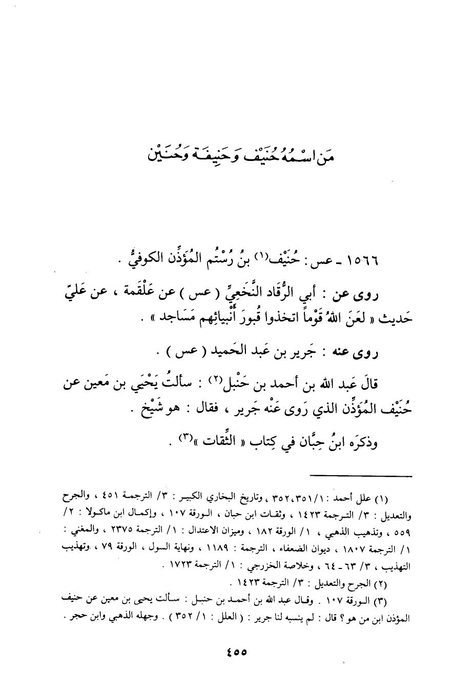 (3) الورقة 107. وَقَال عَبد الله بن أحمد بن حنبل: سألت يحيى بن مَعِين عن حنيف المؤذن ابن من هو؟ قال: لم ينسبه لنا جرير: (العلل: 1 / 352) . وجهله الذهبي وابن حجر.