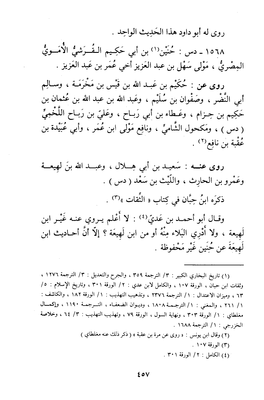 1568 - د س: حنين بن أَبي حكيم القرشي الأُمَوِي المِصْرِي (1) ، مولى سهل عبد العزيز أخي عُمَر بن عبد العزيز.